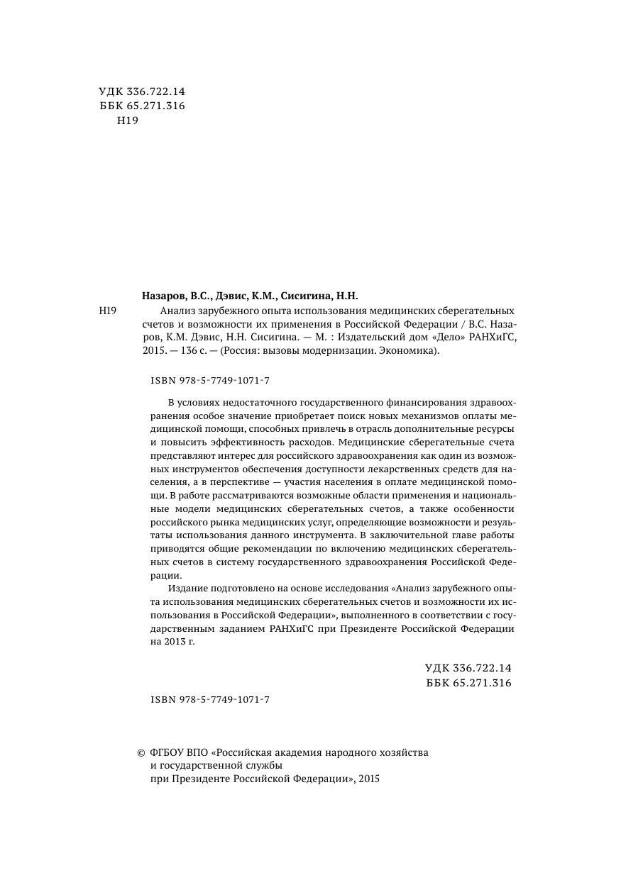 Серия Россия. Вызовы модернизации. Социальная политика. В условиях недостаточного государственного финансирования здравоохранения особое значение приобретает поиск новых механизмов оплаты медицинской помощи, способных привлечь в отрасль дополнительные ресурсы и повысить эффективность расходов. Медицинские сберегательные счета представляют интерес для российского здравоохранения как один из возможных инструментов обеспечения доступности лекарственных средств для населения, а в перспективе — участия населения в оплате медицинской помощи. В работе рассматриваются возможные области применения и национальные модели медицинских сберегательных счетов, а также особенности российского рынка медицинских услуг, определяющие возможности и результаты использования данного инструмента. В заключительной главе работы приводятся общие рекомендации по включению медицинских сберегательных счетов в систему государственного здравоохранения Российской Федерации. Издание подготовлено на основе исследования «Анализ зарубежного опыта использования медицинских сберегательных счетов и возможности их использования в Российской Федерации», выполненного в соответствии с государственным заданием РАНХиГС при Президенте Российской Федерации на 2013 г.