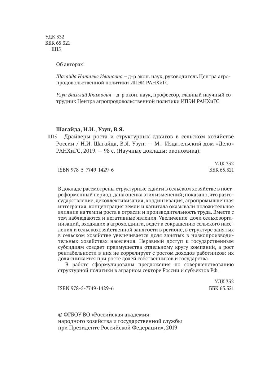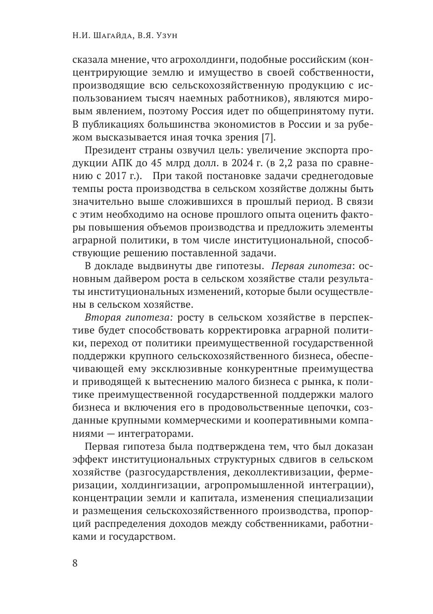 В докладе рассмотрены структурные сдвиги в сельском хозяйстве в постреформенный период, дана оценка этих изменений, показано, что разгосударствление, деколлективизация, холдингизация, агропромышленная интеграция, концентрация земли и капитала оказывали положительное влияние на темпы роста в отрасли и производительность труда. Вместе с тем наблюдаются и негативные явления. Увеличение доли сельхозорганизаций, входящих в агрохолдинги, ведет к сокращению сельского населения и сельскохозяйственной занятости в регионе, в структуре занятых в сельском хозяйстве увеличивается доля занятых в низкопроизводительных хозяйствах населения. Неравный доступ к государственным субсидиям создает преимущества отдельному кругу компаний, а рост рентабельности в них не коррелирует с ростом доходов работников: их доля снижается при росте долей собственников и государства. В работе сформулированы предложения по совершенствованию структурной политики в аграрном секторе России и субъектов РФ.