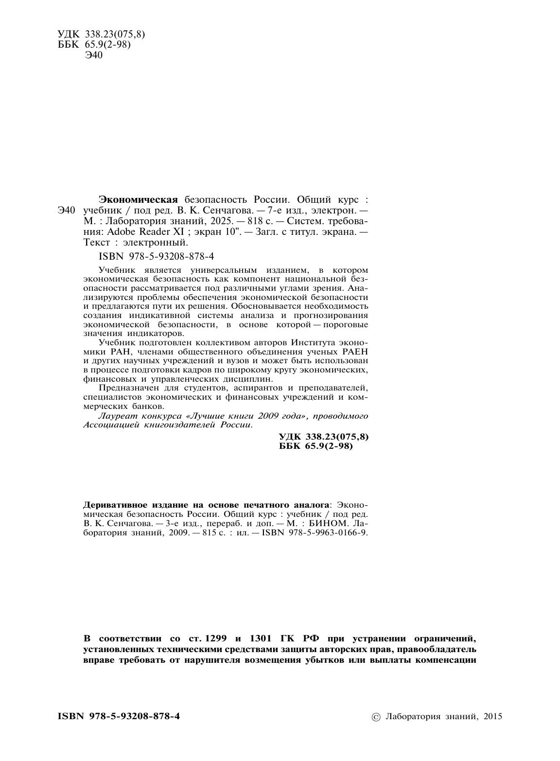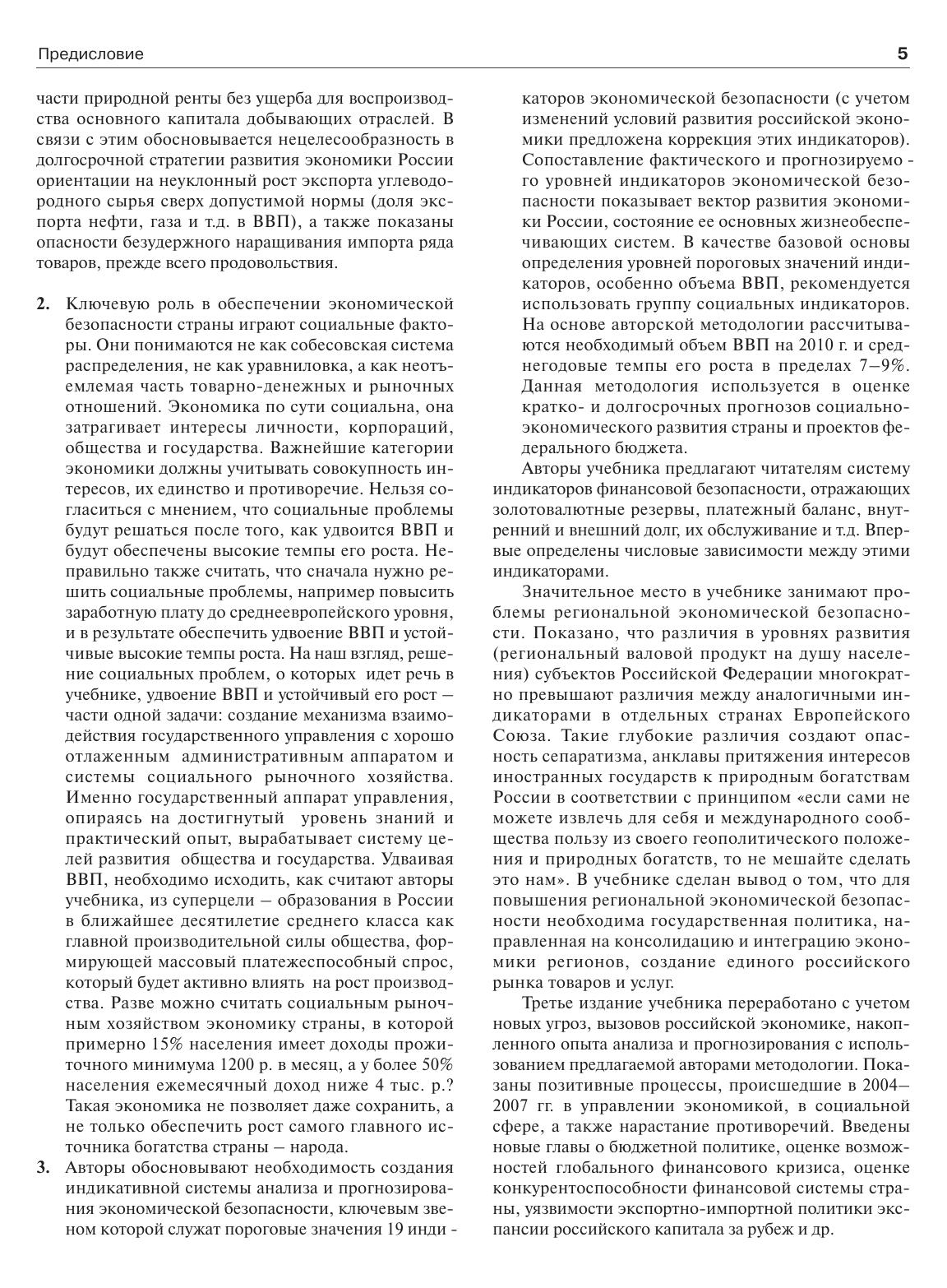 Учебник является универсальным изданием, в котором экономическая безопасность как компонент национальной безопасности рассматривается под различными углами зрения. Анализируются проблемы обеспечения экономической безопасности и предлагаются пути их решения. Обосновывается необходимость создания индикативной системы анализа и прогнозирования экономической безопасности, в основе которой—пороговые значения индикаторов. Учебник подготовлен коллективом авторов Института экономики РАН, членами общественного объединения ученых РАЕН и других научных учреждений и вузов и может быть использован в процессе подготовки кадров по широкому кругу экономических, финансовых и управленческих дисциплин. Предназначен для студентов, аспирантов и преподавателей, специалистов экономических и финансовых учреждений и коммерческих банков. Лауреат конкурса «Лучшие книги 2009 года», проводимого Ассоциацией книгоиздателей России.