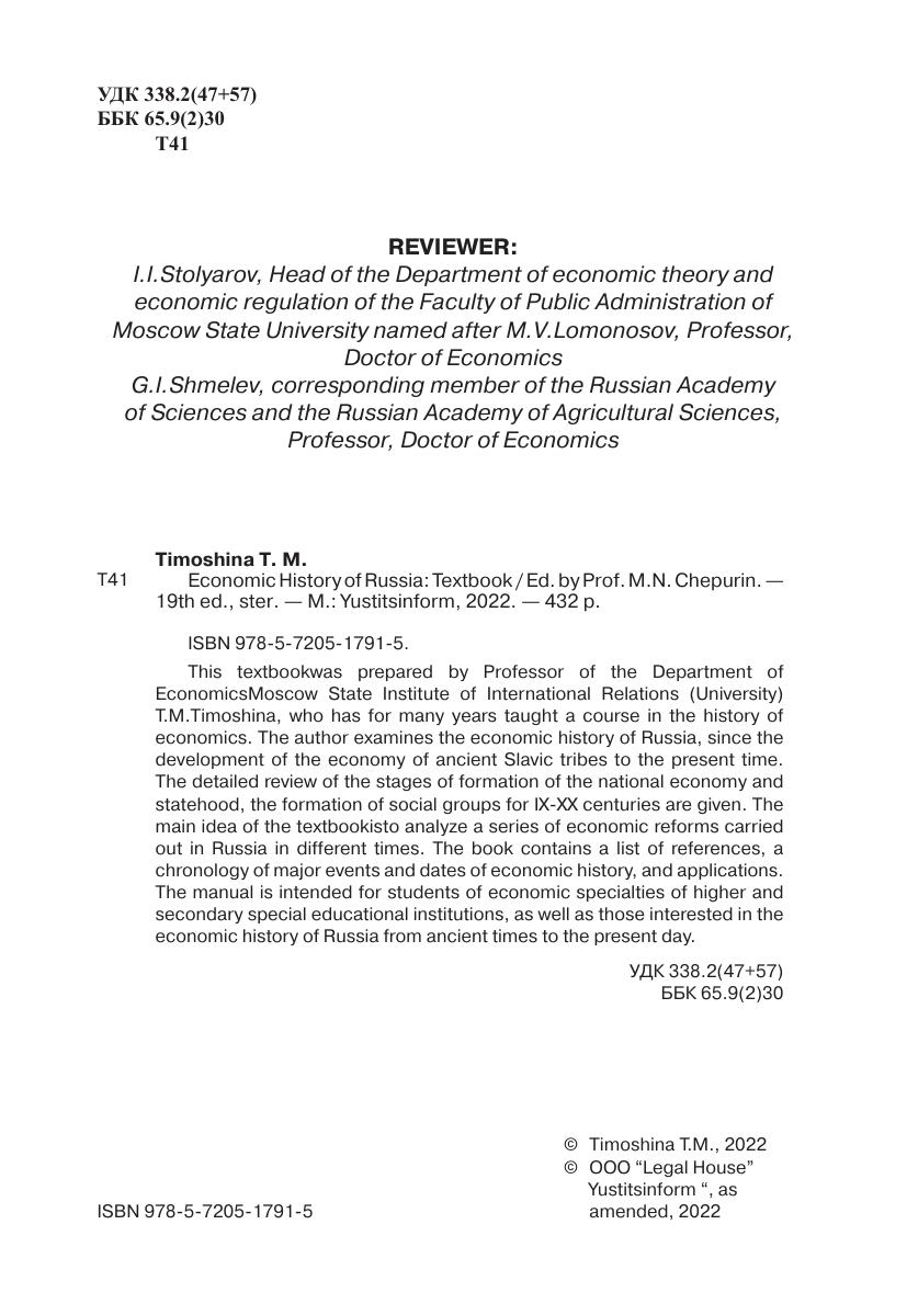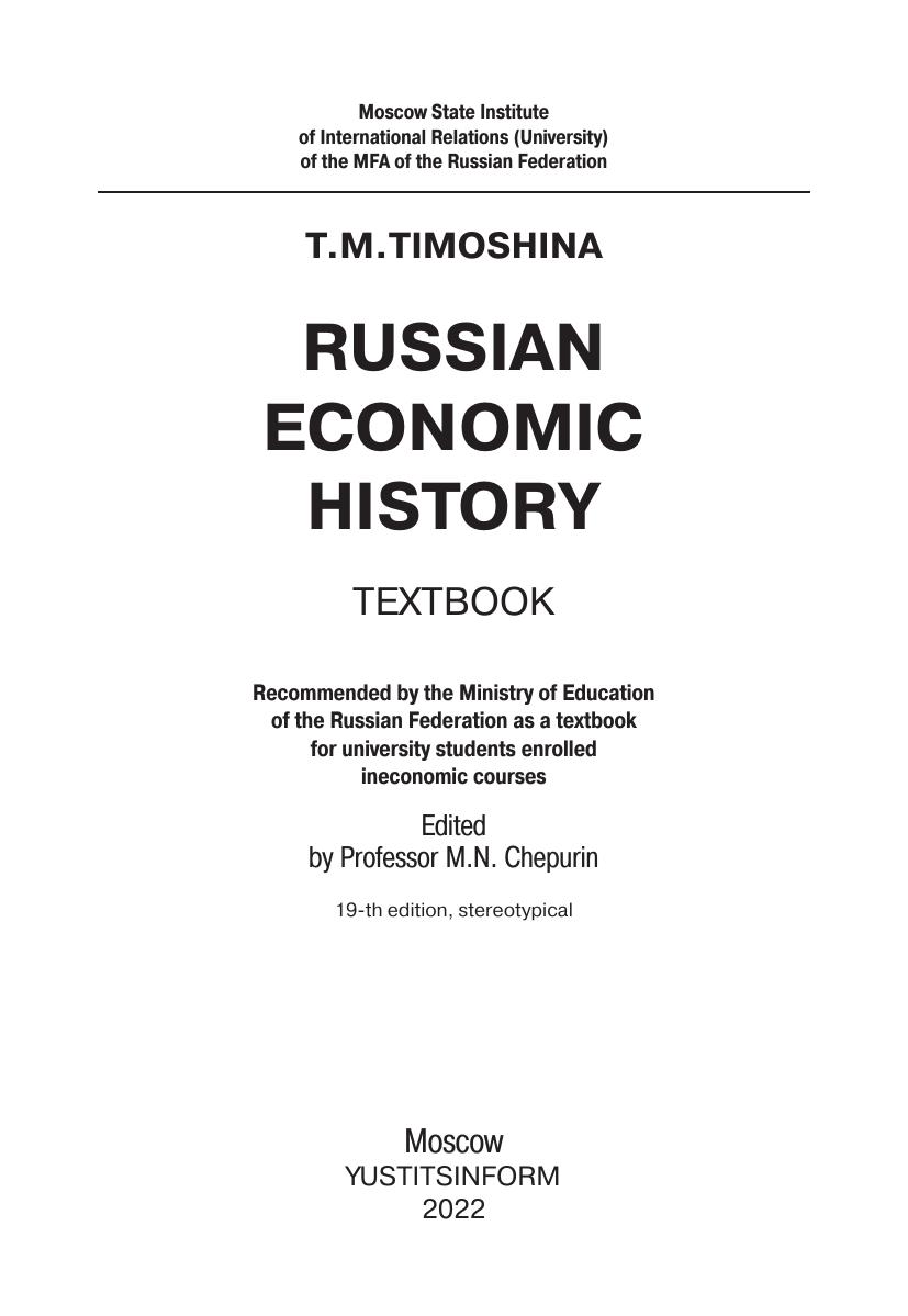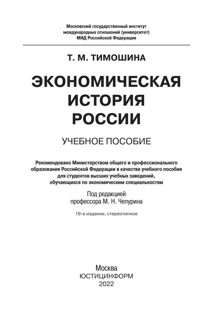 Настоящее учебное пособие подготовлено профессором кафедры экономической теории МГИМО(У) Т.М. Тимошиной, в течение многих лет читающей курс истории экономики. Автор исследует экономическую историю России, начиная с развития хозяйства древних славянских племен и до настоящего времени. Подробно рассматриваются этапы становления народного хозяйства и государственности, формирования социальных слоев населения на протяжении IX—XX веков. Основная идея учебного пособия — проанализировать череду экономических реформ, проводившихся в России в разное время. В книге приводятся список литературы, хронология основных событий и дат экономической истории, и приложения. Учебное пособие рассчитано на студентов экономических специальностей высших и средних специальных учебных заведений, а также на тех, кто интересуется экономической историей России с древности до наших дней.