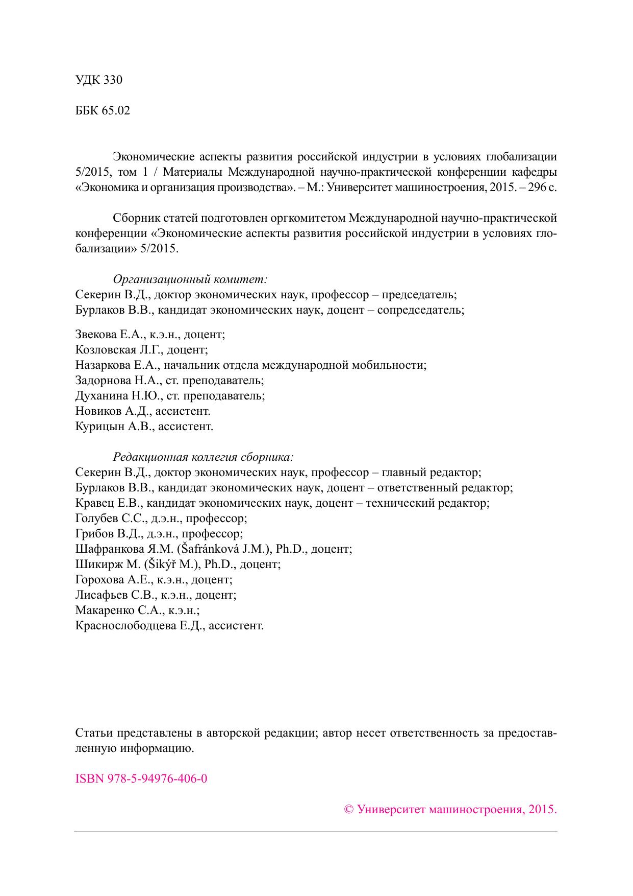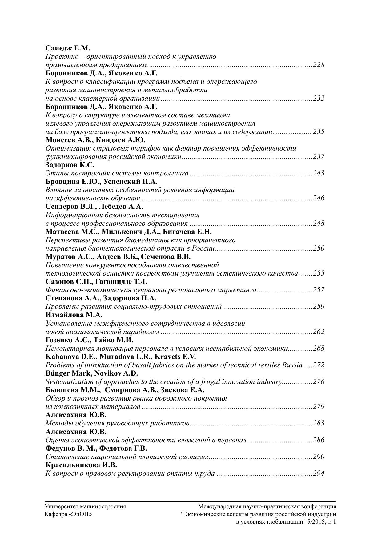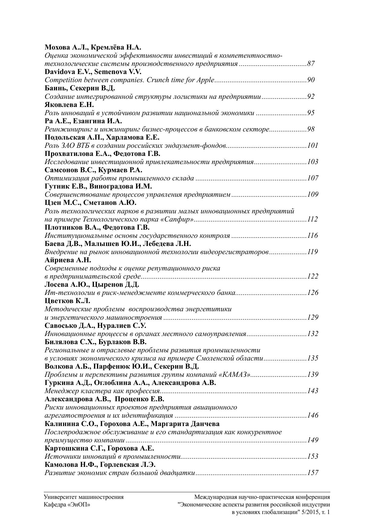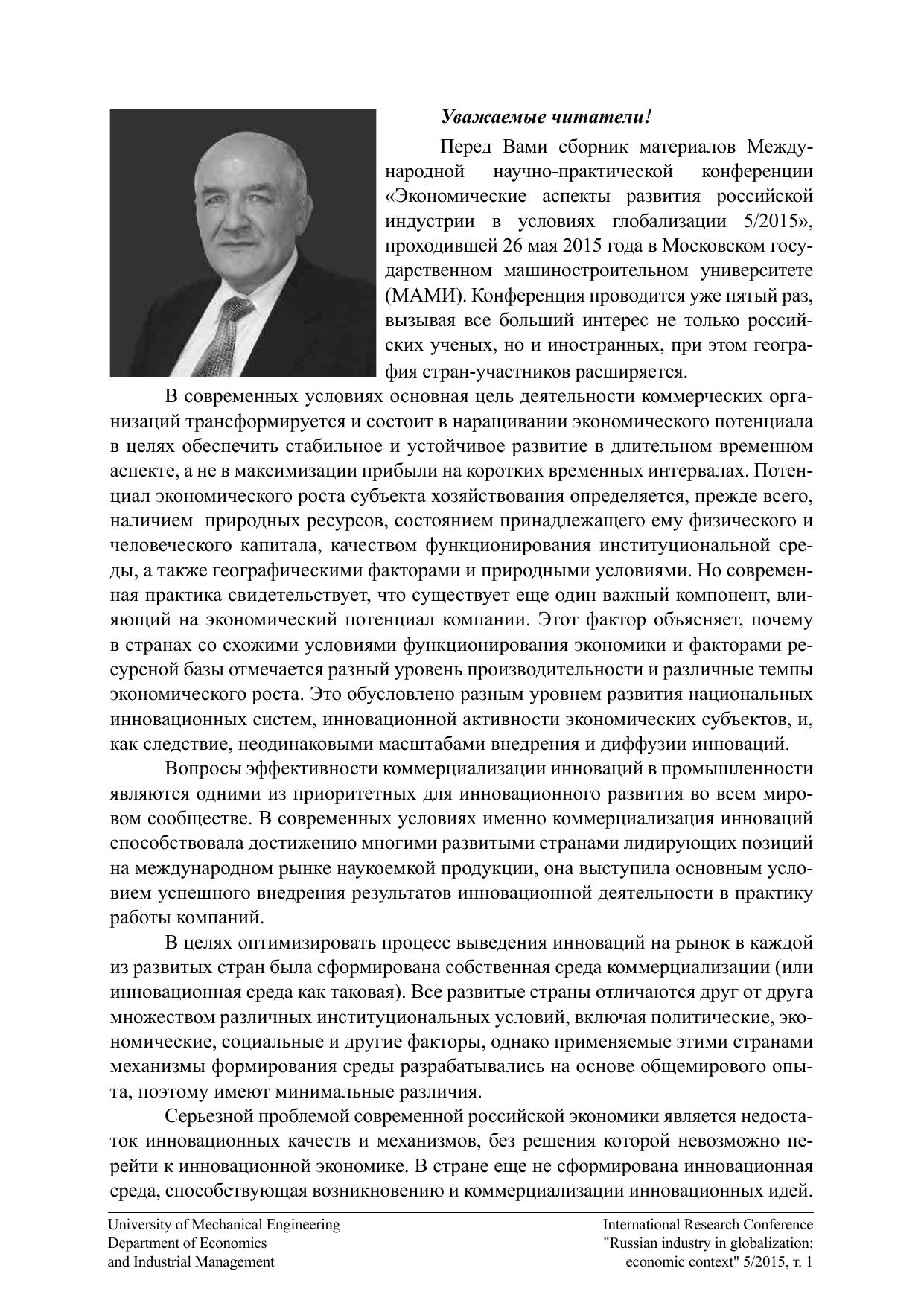 Экономические аспекты развития российской индустрии в условиях глобализации 5/2015. Том 1. Материалы Международной научно-практической конференции кафедры «Экономика и организация производства»