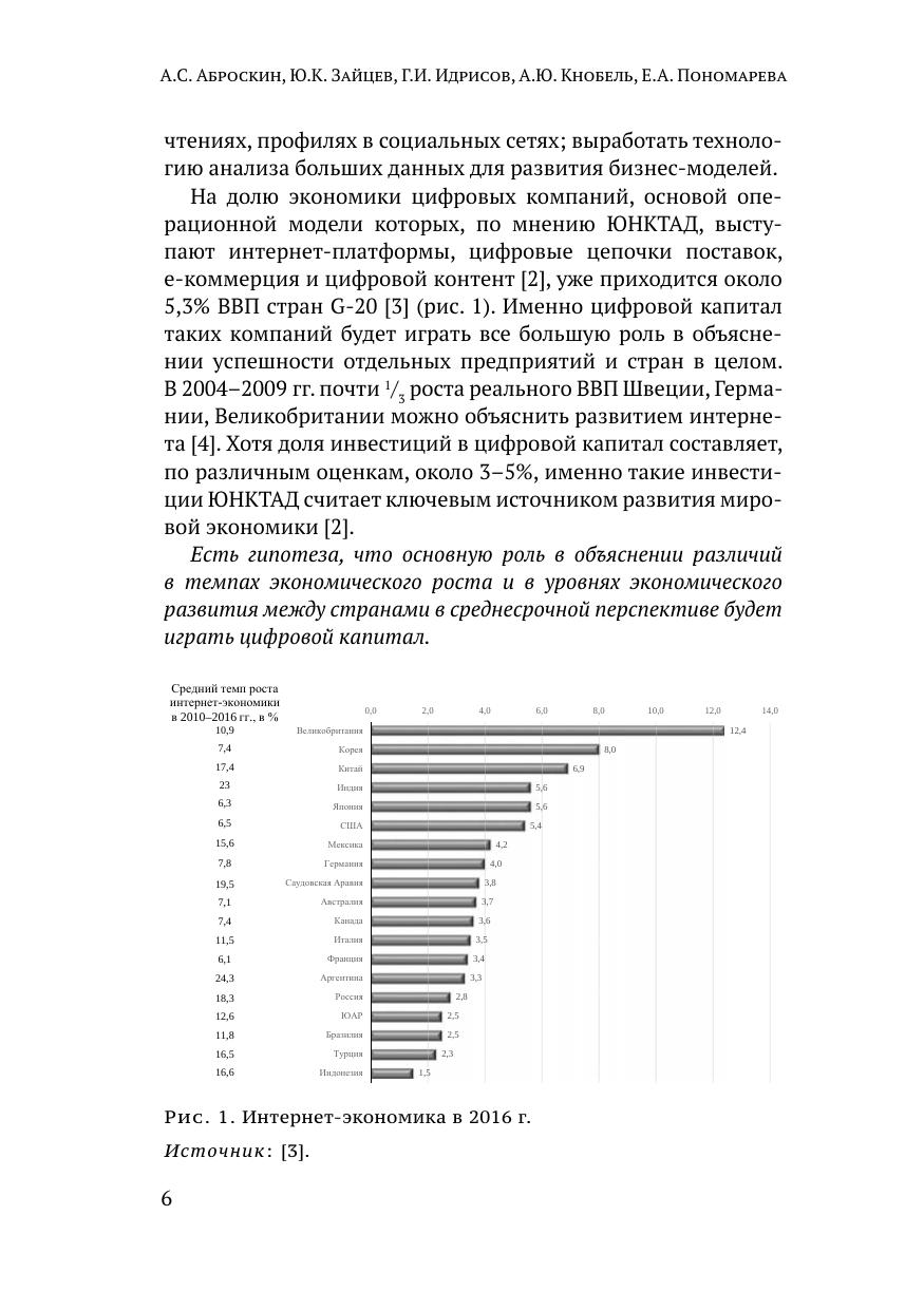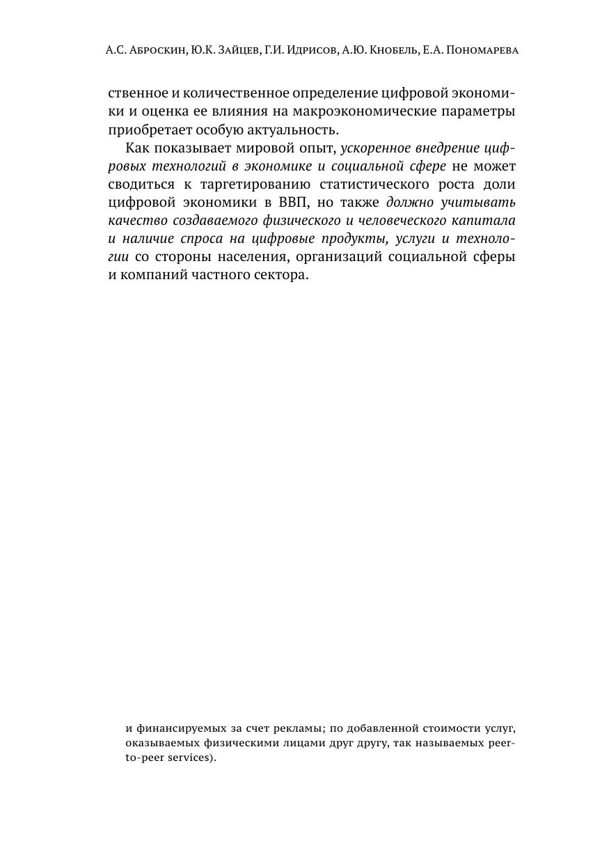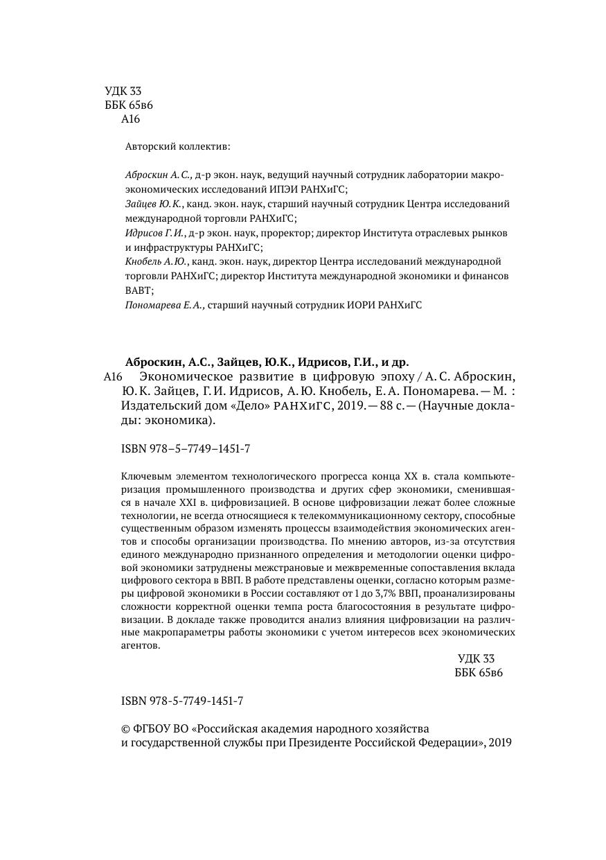 Ключевым элементом технологического прогресса конца XX в. стала компьютеризация промышленного производства и других сфер экономики, сменившаяся в начале XXI в. цифровизацией. В основе цифровизации лежат более сложные технологии, не всегда относящиеся к телекоммуникационному сектору, способные существенным образом изменять процессы взаимодействия экономических агентов и способы организации производства. По мнению авторов, из-за отсутствия единого международно признанного определения и методологии оценки цифровой экономики затруднены межстрановые и межвременные сопоставления вклада цифрового сектора в ВВП. В работе представлены оценки, согласно которым размеры цифровой экономики в России составляют от до ,% ВВП, проанализированы сложности корректной оценки темпа роста благосостояния в результате цифровизации. В докладе также проводится анализ влияния цифровизации на различные макропараметры работы экономики с учетом интересов всех экономических агентов.
