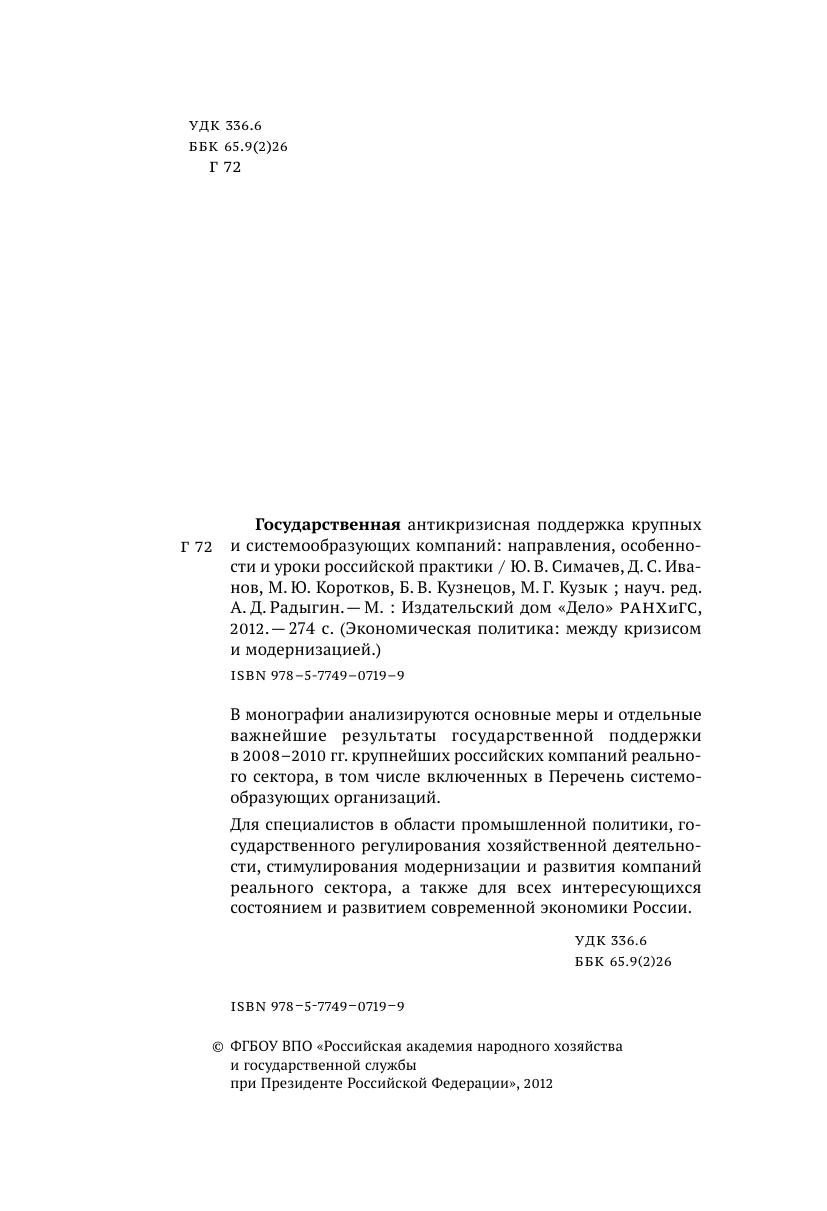 Экономическая политика: между кризисом и модернизацией. В монографии анализируются основные меры и отдельные важнейшие результаты государственной поддержки в 2008? – ? 2010 гг. крупнейших российских компаний реального сектора, в том числе включенных в Перечень системообразующих организаций. Для специалистов в области промышленной политики, государственного регулирования хозяйственной деятельности, стимулирования модернизации и развития компаний реального сектора, а также для всех интересующихся состоянием и развитием современной экономики России.