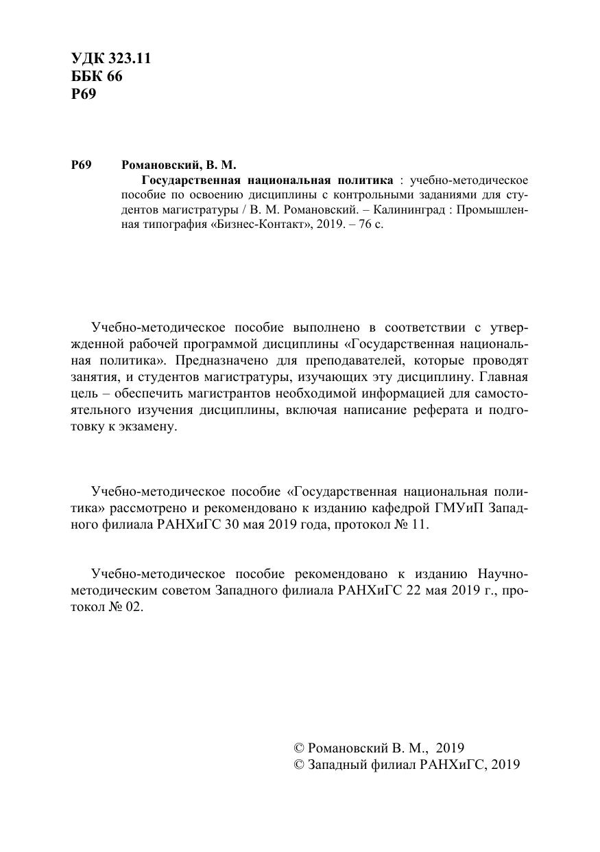 Учебно-методическое пособие выполнено в соответствии с утвер-жденной рабочей программой дисциплины «Государственная националь-ная политика». Предназначено для преподавателей, которые проводят занятия, и студентов магистратуры, изучающих эту дисциплину. Главная цель – обеспечить магистрантов необходимой информацией для самосто-ятельного изучения дисциплины, включая написание реферата и подго-товку к экзамену.