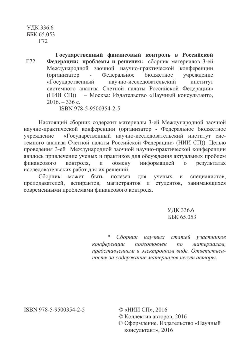 Настоящий сборник содержит материалы 3-ей Международной заочной научно-практической конференции (организатор - Федеральное бюджетное учреждение «Государственный научно-исследовательский институт системного анализа Счетной палаты Российской Федерации» (НИИ СП)). Целью проведения 3-ей Международной заочной научно-практической конференции явилось привлечение ученых и практиков для обсуждения актуальных проблем финансового контроля, и обмену информацией о результатах исследовательских работ для их решений. Сборник может быть полезен для ученых и специалистов, преподавателей, аспирантов, магистрантов и студентов, занимающихся современными проблемами финансового контроля.