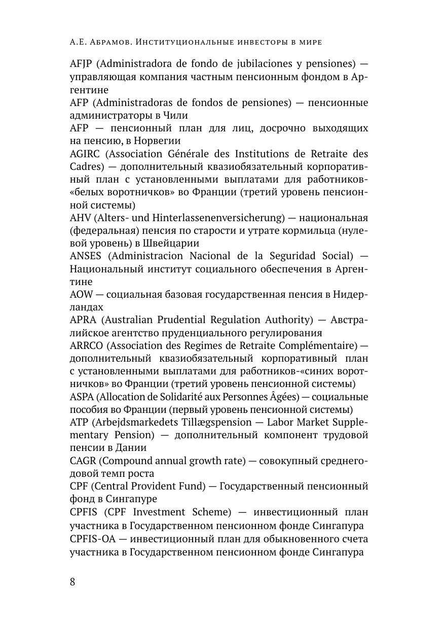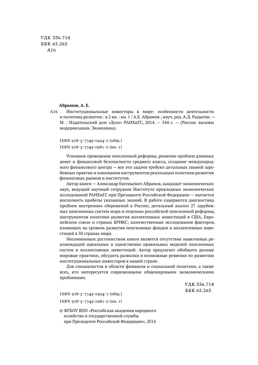 Серия Россия. Вызовы модернизации. Социальная политика. Успешное проведение пенсионной реформы, решение проблем длинных денег и финансовой безопасности среднего класса, создание международного финансового центра - все эти задачи требуют детальных знаний зарубежных практик и понимания инструментов реализации политики развития финансовых рынков и институтов. Автор книги - Александр Евгеньевич Абрамов, кандидат экономических наук, ведущий научный сотрудник Института прикладных экономических исследований РАНХиГС при Президенте Российской Федерации - пытается восполнить пробелы указанных знаний. В работе содержится диагностика проблем внутренних сбережений в России, детальный анализ 27 зарубежных пенсионных систем мира и отдельно российской пенсионной реформы, инструментов политики развития коллективных инвестиций в США, Европейском Союзе и странах БРИКС, количественные исследования факторов, влияющих на уровень развития пенсионных фондов и коллективных инвестиций в 50 странах мира. Несомненным достоинством книги является отсутствие навязчивых рекомендаций идеальных и единственно правильных моделей пенсионных систем и коллективных инвестиций. Автор предлагает обобщить разные мировые практики, обсудить развилки и возможные решения по развитию институциональных инвесторов в нашей стране. Для специалистов в области финансов и социальной политики, а также всех, кто интересуется современными общемировыми экономическими проблемами.