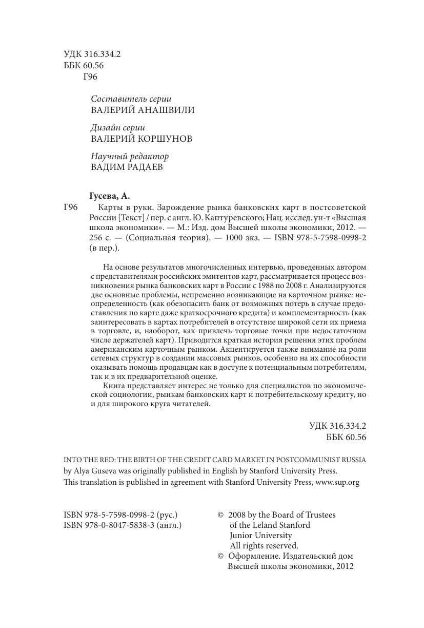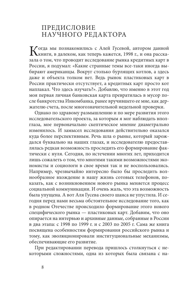 На основе результатов многочисленных интервью, проведенных автором с представителями российских эмитентов карт, рассматривается процесс возникновения рынка банковских карт в России с 1988 по 2008 г. анализируются две основные проблемы, непременно возникающие на карточном рынке: неопределенность (как обезопасить банк от возможных потерь в случае предоставления по карте даже краткосрочного кредита) и комплементарность (как заинтересовать в картах потребителей в отсутствие широкой сети их приема в торговле, и, наоборот, как привлечь торговые точки при недостаточном числе держателей карт). Приводится краткая история решения этих проблем американским карточным рынком. акцентируется также внимание на роли сетевых структур в создании массовых рынков, особенно на их способности оказывать помощь продавцам как в доступе к потенциальным потребителям, так и в их предварительной оценке. Книга представляет интерес не только для специалистов по экономической социологии, рынкам банковских карт и потребительскому кредиту, но и для широкого круга читателей.