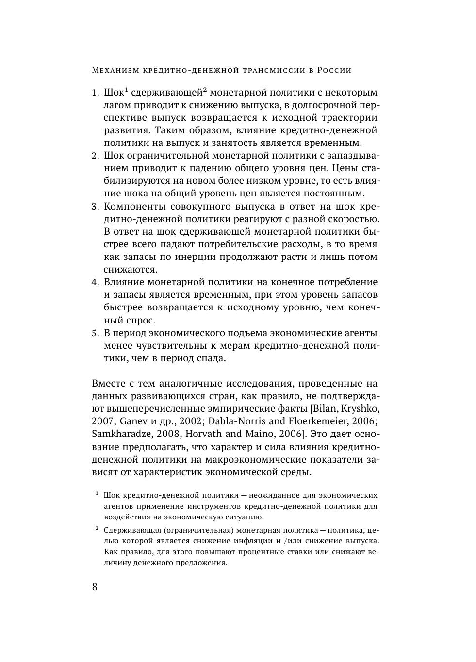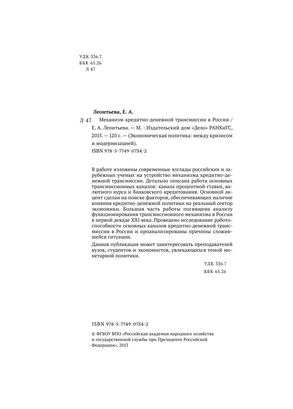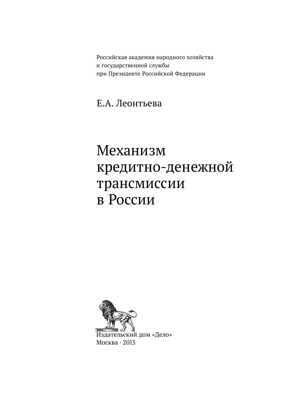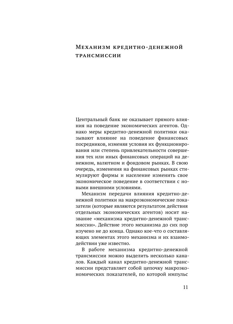 Экономическая политика: между кризисом и модернизацией. В работе изложены современные взгляды российских и зарубежных учeных на устройство механизма кредитно-денежной трансмиссии. Детально описана работа основных трансмиссионных каналов: канала процентной ставки, валютного курса и банковского кредитования. Основной акцент сделан на поиске факторов, обеспечивающих наличие влияния кредитно-денежной политики на реальный сектор экономики. Большая часть работы посвящена анализу функционирования трансмиссионного механизма в России в первой декаде XXI века. Проведено исследование работоспособности основных каналов кредитно-денежной трансмиссии в России и проанализированы причины сложившейся ситуации. Данная публикация может заинтересовать преподавателей вузов, студентов и экономистов, увлекающихся темой монетарной политики.