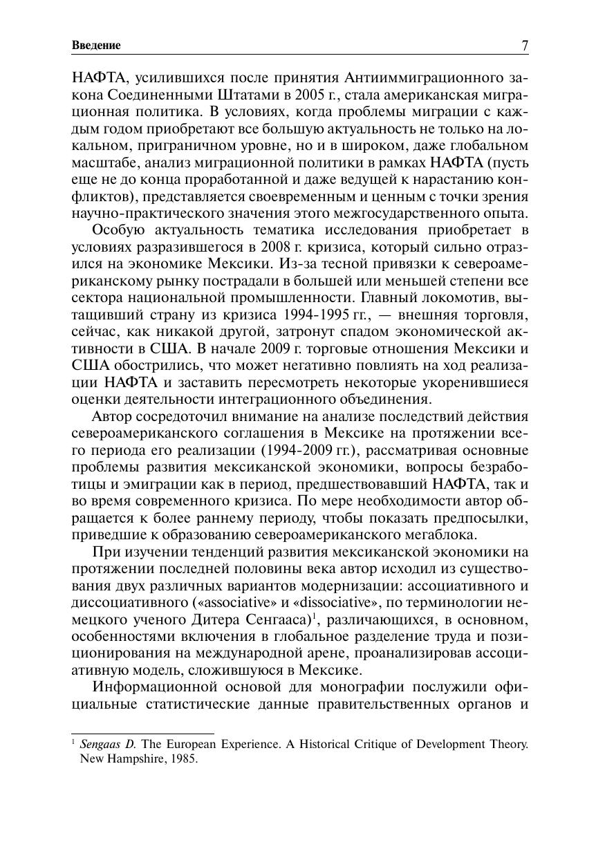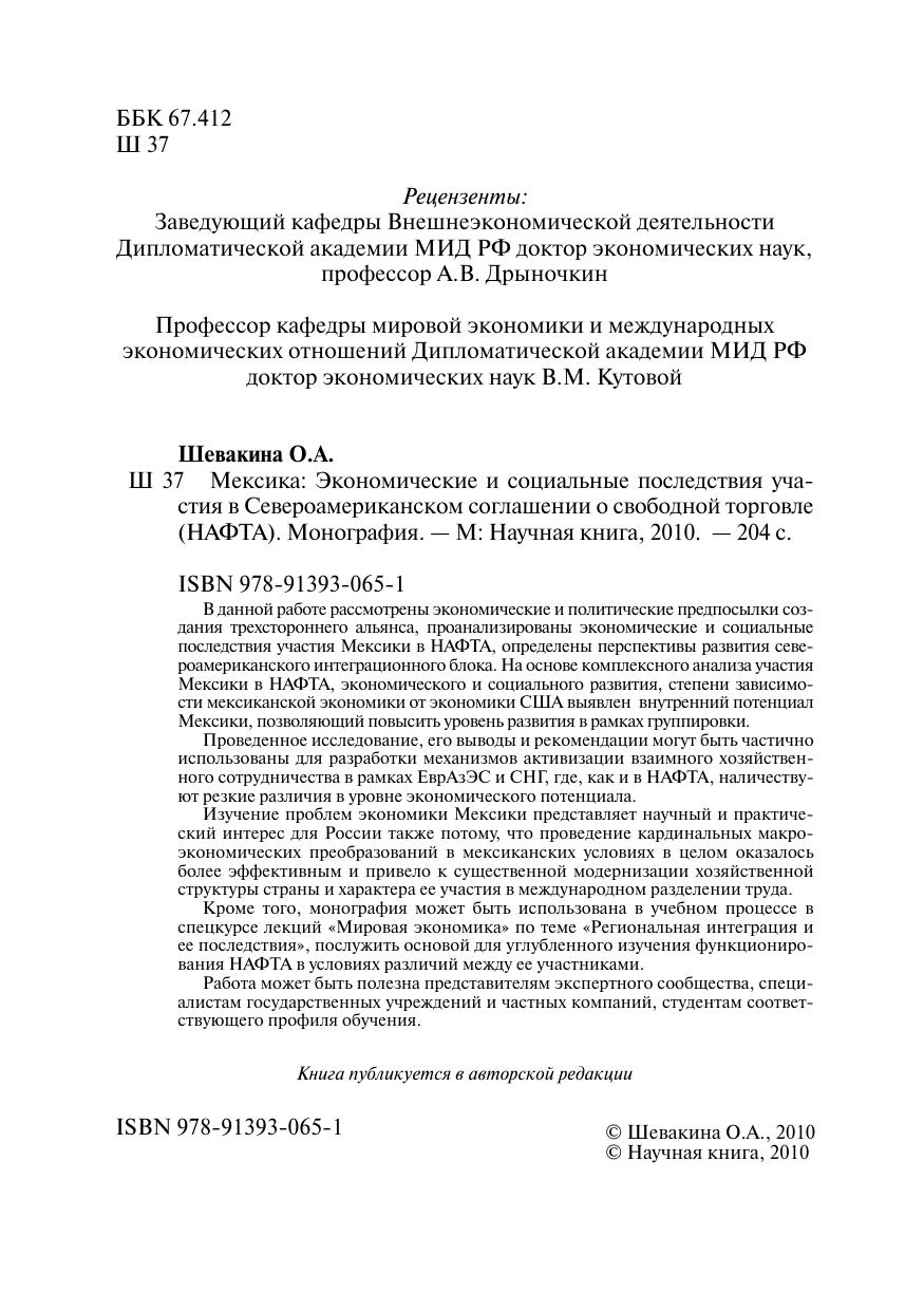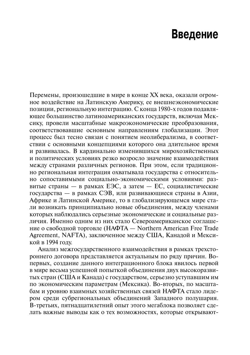 В данной работе рассмотрены экономические и политические предпосылки создания трехстороннего альянса, проанализированы экономические и социальные последствия участия Мексики в НАФТА, определены перспективы развития североамериканского интеграционного блока. На основе комплексного анализа участия Мексики в НАФТА, экономического и социального развития, степени зависимости мексиканской экономики от экономики США выявлен внутренний потенциал Мексики, позволяющий повысить уровень развития в рамках группировки. Проведенное исследование, его выводы и рекомендации могут быть частично использованы для разработки механизмов активизации взаимного хозяйственного сотрудничества в рамках ЕврАзЭС и СНГ, где, как и в НАФТА, наличествуют резкие различия в уровне экономического потенциала. Изучение проблем экономики Мексики представляет научный и практический интерес для России также потому, что проведение кардинальных макро-экономических преобразований в мексиканских условиях в целом оказалось более эффективным и привело к существенной модернизации хозяйственной структуры страны и характера ее участия в международном разделении труда. Кроме того, монография может быть использована в учебном процессе в спецкурсе лекций «Мировая экономика» по теме «Региональная интеграция и ее последствия», послужить основой для углубленного изучения функционирования НАФТА в условиях различий между ее участниками. Работа может быть полезна представителям экспертного сообщества, специалистам государственных учреждений и частных компаний, студентам соответствующего профиля обучения.