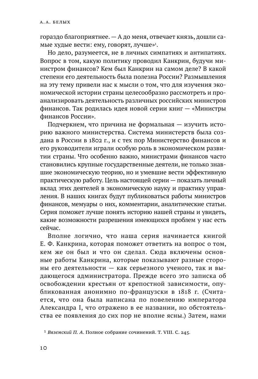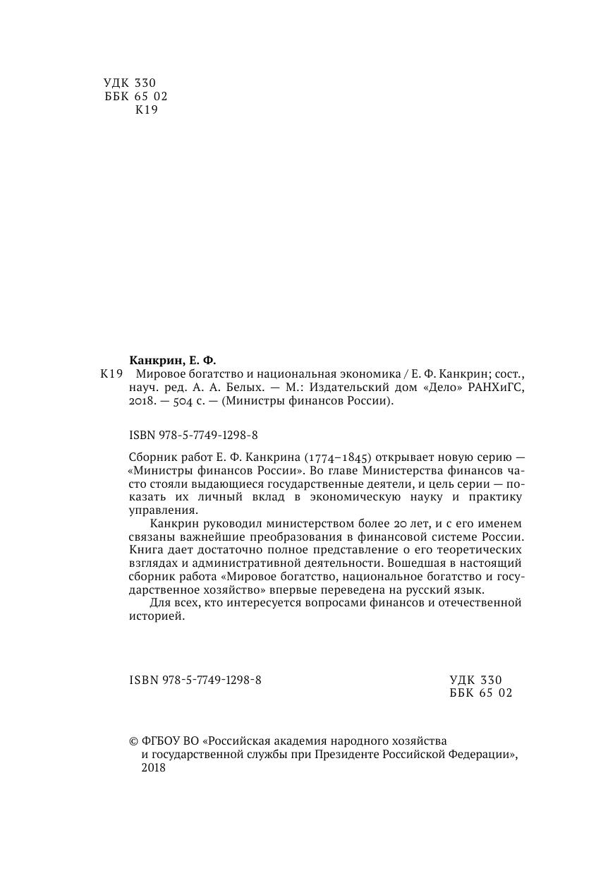Сборник работ Е. Ф. Канкрина (1774–1845) открывает новую серию — «Министры финансов России». Во главе Министерства финансов часто стояли выдающиеся государственные деятели, и цель серии — показать их личный вклад в экономическую науку и практику управления. Канкрин руководил министерством более лет, и с его именем связаны важнейшие преобразования в финансовой системе России. Книга дает достаточно полное представление о его теоретических взглядах и административной деятельности. Вошедшая в настоящий сборник работа «Мировое богатство, национальное богатство и государственное хозяйство» впервые переведена на русский язык. Для всех, кто интересуется вопросами финансов и отечественной историей.