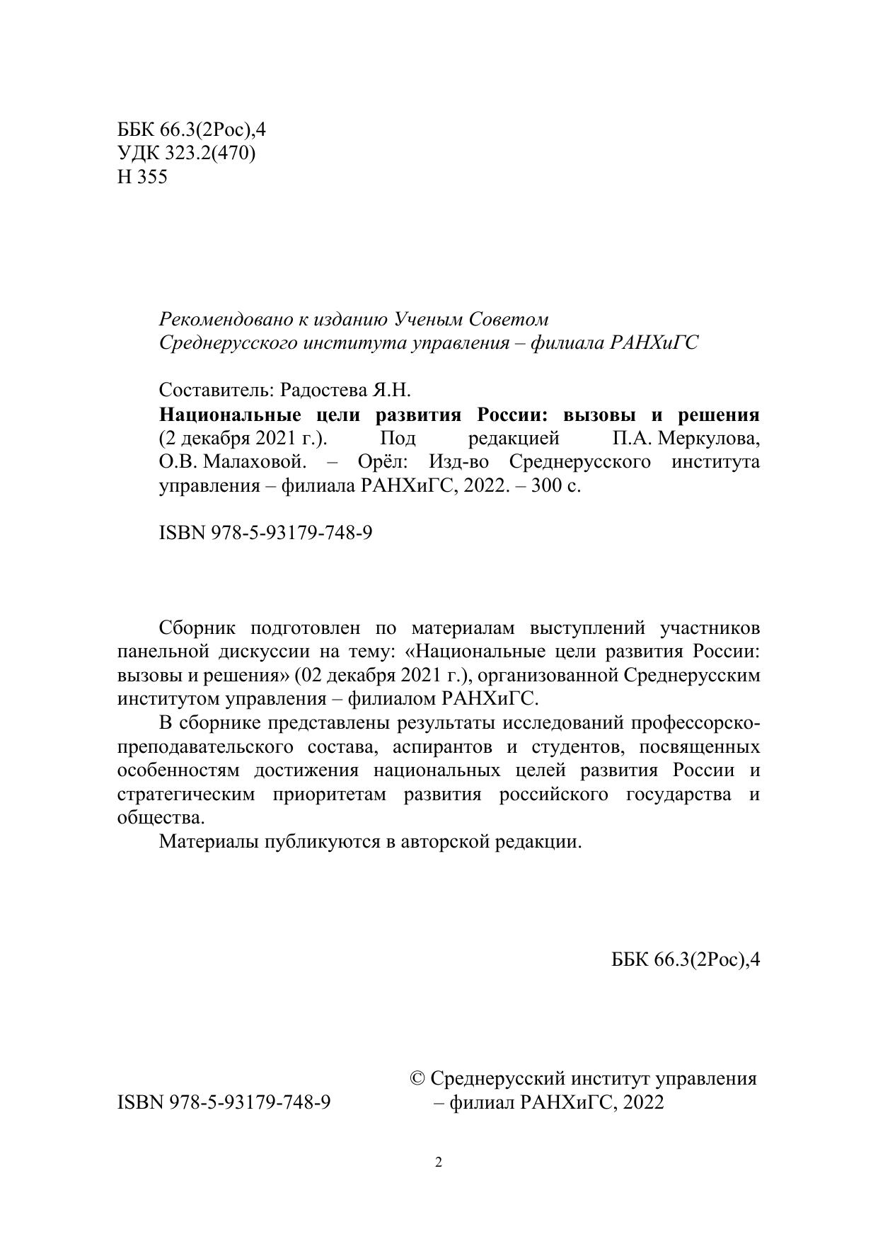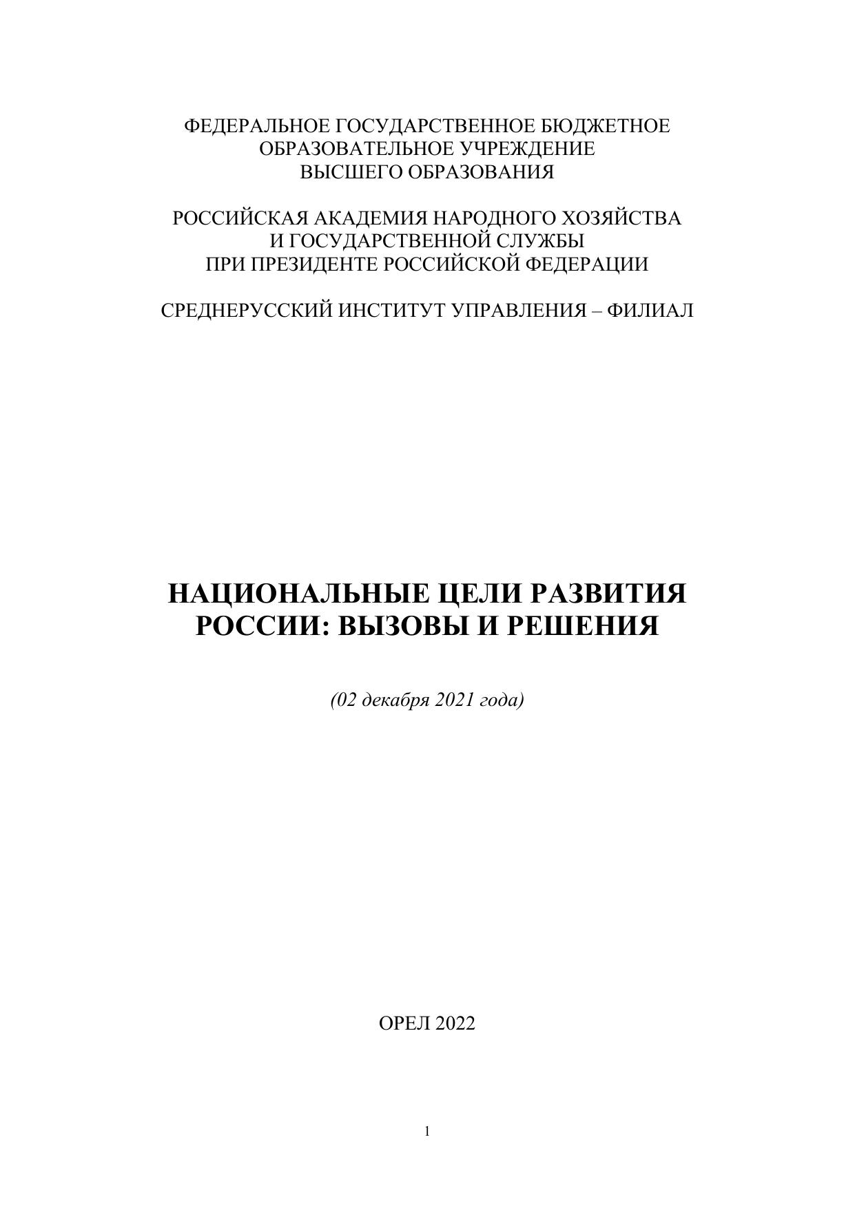 Сборник подготовлен по материалам выступлений участников панельной дискуссии на тему: «Национальные цели развития России: вызовы и решения» (02 декабря 2021 г.), организованной Среднерусским институтом управления – филиалом РАНХиГС. В сборнике представлены результаты исследований профессорскопреподавательского состава, аспирантов и студентов, посвященных особенностям достижения национальных целей развития России и стратегическим приоритетам развития российского государства и общества. Материалы публикуются в авторской редакции.