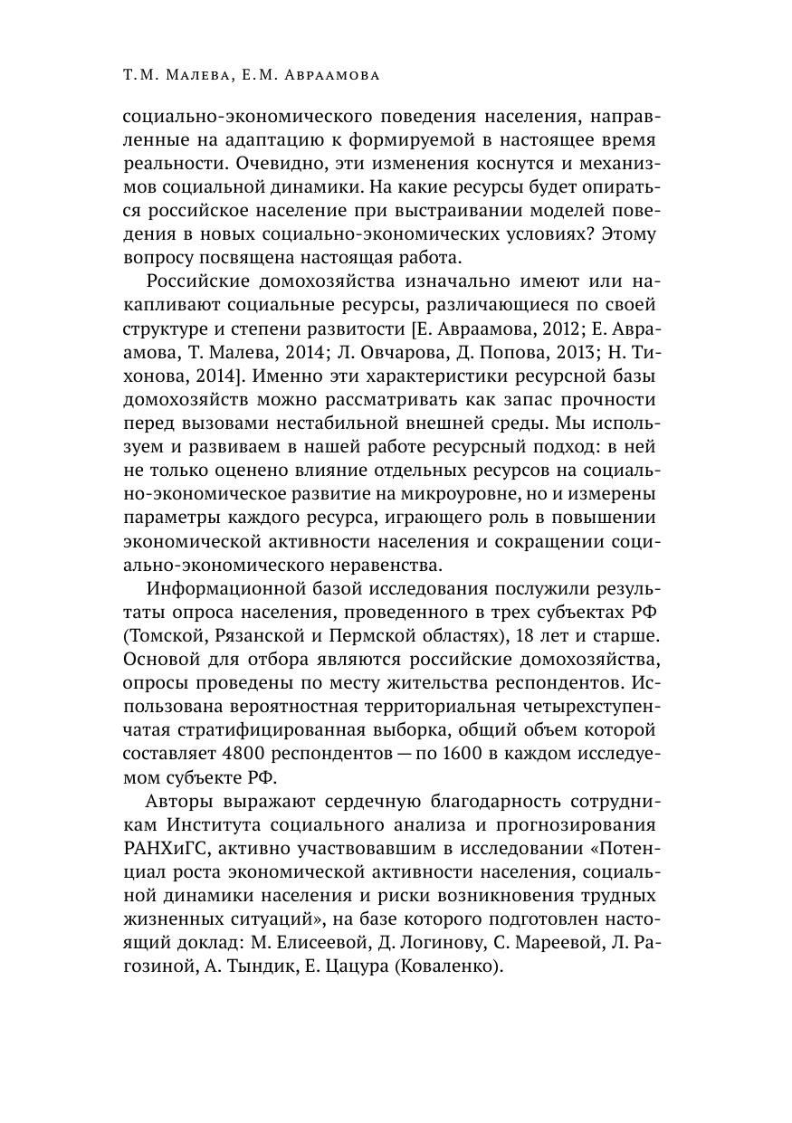 Серия Научные доклады. Доклад подготовлен на базе исследования «Потенциал роста экономической активности населения, социальная динамика населения и риски возникновения трудных жизненных ситуаций», проведенного Институтом социального анализа и прогнозирования РАНХиГС в 2014 г. Цель исследования состояла в выявлении барьеров и перспектив роста экономической активности населения. Информационная база исследования – опрос 4800 респондентов в трех регионах России, различающихся уровнем социально-экономического положения. В работе определены ресурсные характеристики, влияющие на экономическую активность населения, выявлены значения факторов, определяющих ее рост или, наоборот, торможение, а также установлена связь ресурсного потенциала домохозяйств с уровнем благосостояния. Полученные результаты говорят о весьма ограниченном эффекте, который может дать сегодняшняя парадигма социальной политики с преобладающими мерами монетарной помощи бедным, которые могут позволить домохозяйствам поддерживать существование на грани физического выживания, но не способствуют устранению структурных предпосылок бедности и предпосылок ее межпоколенного воспроизводства («ловушка бедности»). Разработка мер, направленных на повышение ресурсообеспеченности как самих бедных, так и тех, кто находится в зоне высоких рисков обеднеть, на наш взгляд, должна стать приоритетом будущей социальной политики.