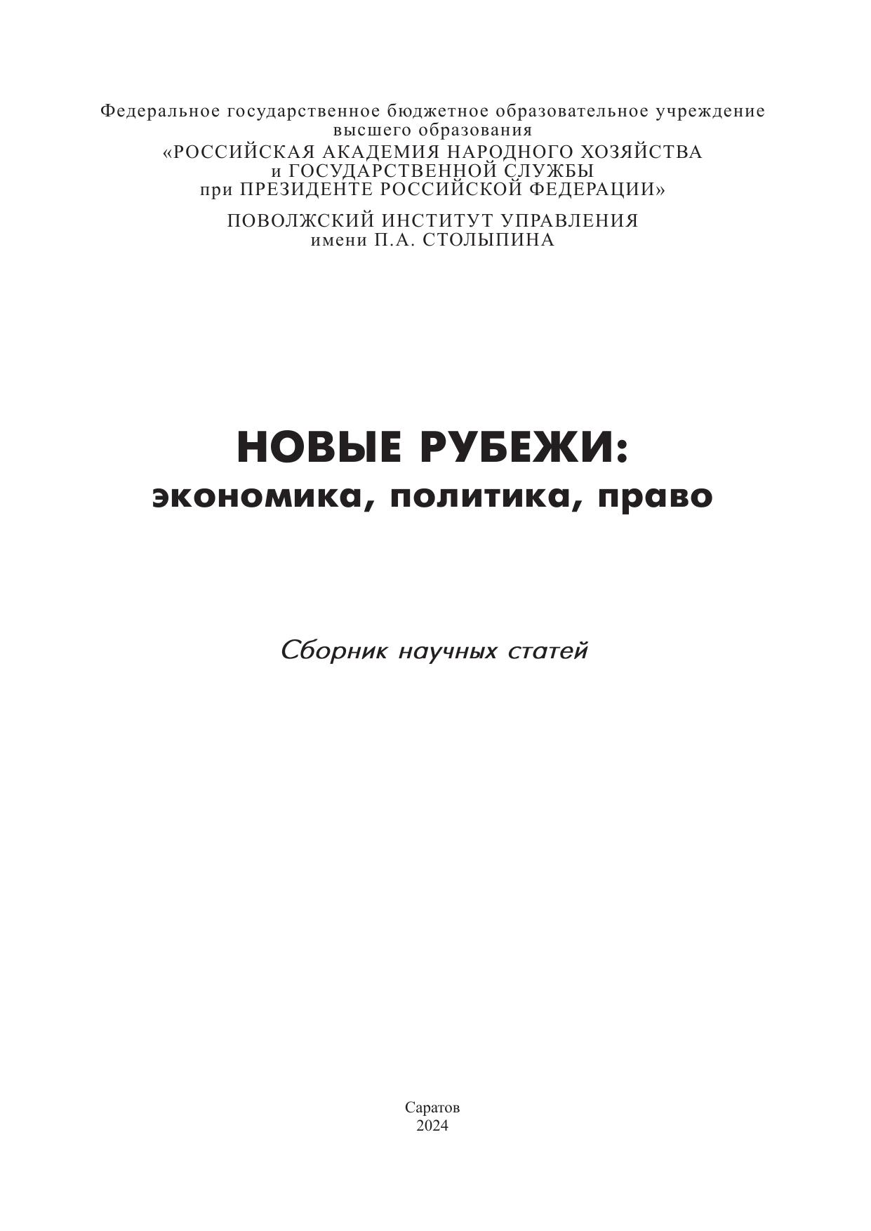 Сборник содержит статьи по материалам межвузовской научно-практической конференции магистрантов, аспирантов, докторантов и молодых ученых, проведеной 8–9 февраля 2024 г. в Поволжском институте управления – филиале РАНХиГС. Рассматриваются проблемы социально-экономического и политико-правового развития России в условиях современных трансформаций. Для студентов, магистрантов, аспирантов вузов, а также всех интересующихся вопросами студенческой науки.