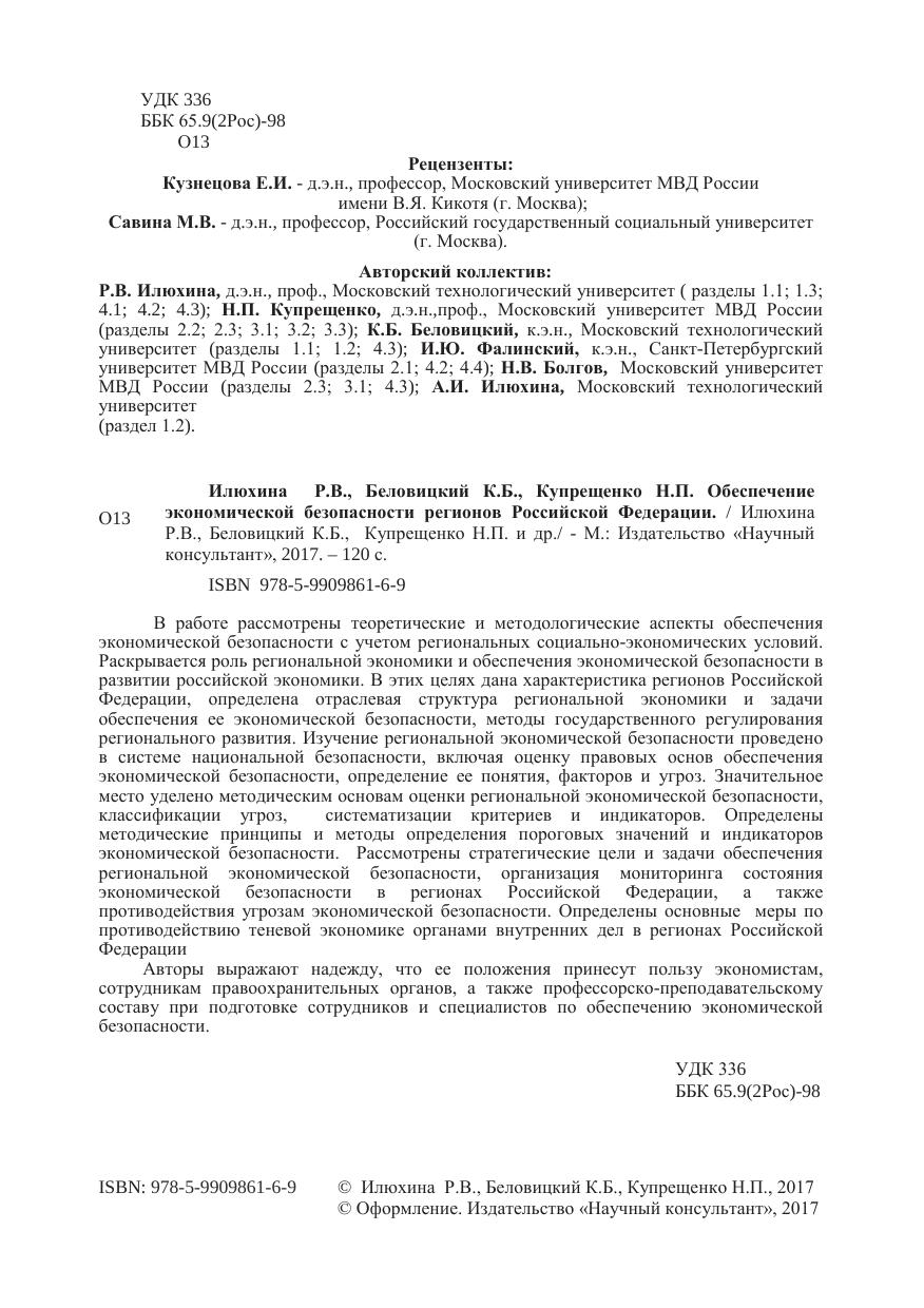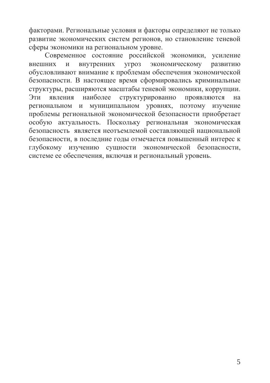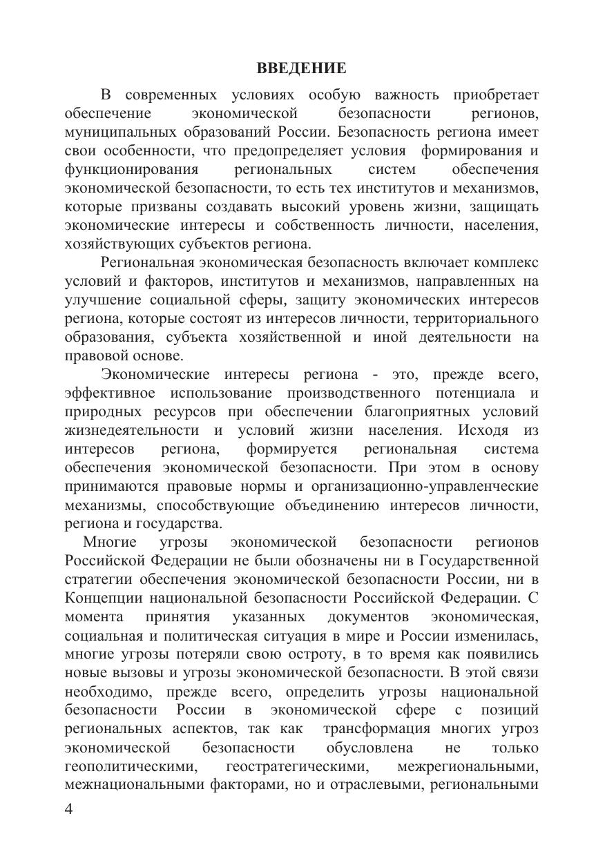 В работе рассмотрены теоретические и методологические аспекты обеспечения экономической безопасности с учетом региональных социально-экономических условий. Раскрывается роль региональной экономики и обеспечения экономической безопасности в развитии российской экономики. В этих целях дана характеристика регионов Российской Федерации, определена отраслевая структура региональной экономики и задачи обеспечения ее экономической безопасности, методы государственного регулирования регионального развития. Изучение региональной экономической безопасности проведено в системе национальной безопасности, включая оценку правовых основ обеспечения экономической безопасности, определение ее понятия, факторов и угроз. Значительное место уделено методическим основам оценки региональной экономической безопасности, классификации угроз, систематизации критериев и индикаторов. Определены методические принципы и методы определения пороговых значений и индикаторов экономической безопасности. Рассмотрены стратегические цели и задачи обеспечения региональной экономической безопасности, организация мониторинга состояния экономической безопасности в регионах Российской Федерации, а также противодействия угрозам экономической безопасности. Определены основные меры по противодействию теневой экономике органами внутренних дел в регионах Российской Федерации