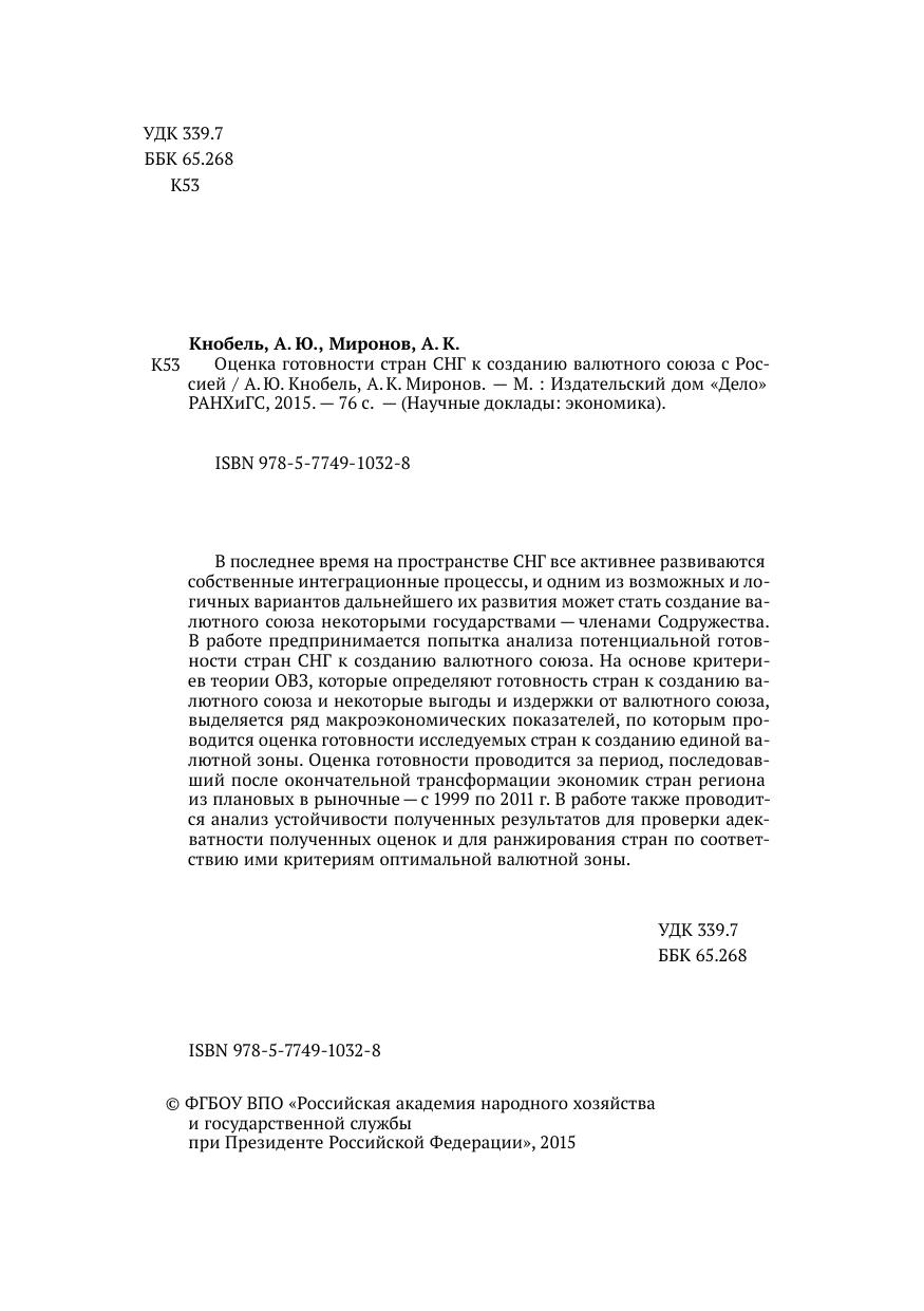 Серия Научные доклады. В последнее время на пространстве СНГ все активнее развиваются собственные интеграционные процессы, и одним из возможных и логичных вариантов дальнейшего их развития может стать создание валютного союза некоторыми государствами — членами Содружества. В работе предпринимается попытка анализа потенциальной готовности стран СНГ к созданию валютного союза. На основе критериев теории ОВЗ, которые определяют готовность стран к созданию валютного союза и некоторые выгоды и издержки от валютного союза, выделяется ряд макроэкономических показателей, по которым проводится оценка готовности исследуемых стран к созданию единой валютной зоны. Оценка готовности проводится за период, последовавший после окончательной трансформации экономик стран региона из плановых в рыночные — с 1999 по 2011г. В работе также проводится анализ устойчивости полученных результатов для проверки адекватности полученных оценок и для ранжирования стран по соответствию ими критериям оптимальной валютной зоны