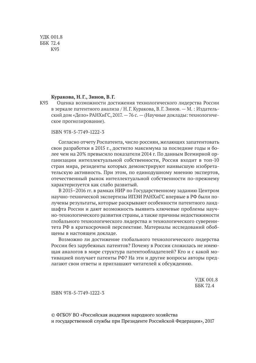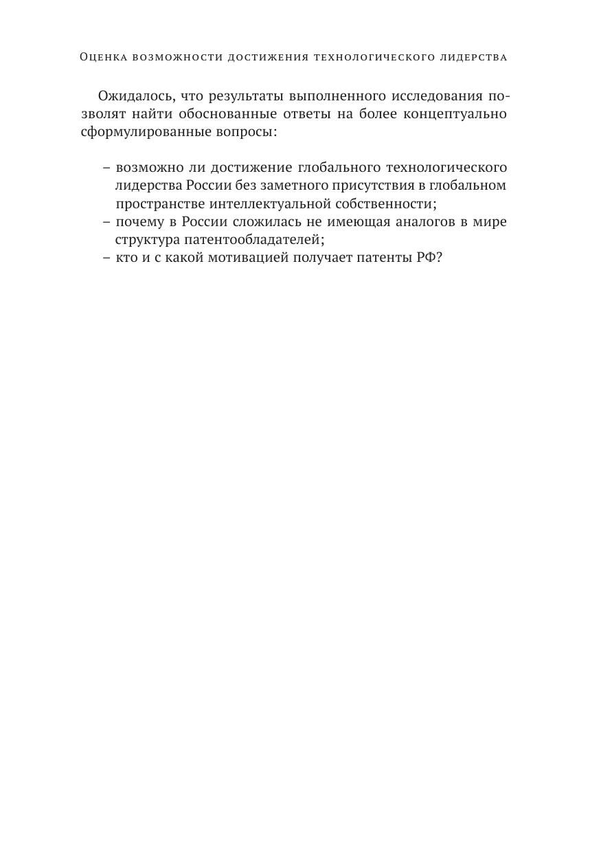 Согласно отчету Роспатента, число россиян, желающих запатентовать свои разработки в 2015 г., достигло максимума за последние годы и более чем на 20% превысило показатели 2014 г. По данным Всемирной организации интеллектуальной собственности, Россия входит в топ-10 стран мира, резиденты которых демонстрируют наивысшую изобретательскую активность. При этом, по единодушному мнению экспертов, отечественный рынок интеллектуальной собственности по-прежнему характеризуется как слабо развитый. В 2015–2016 гг. в рамках НИР по Государственному заданию Центром научно-технической экспертизы ИПЭИ РАНХиГС впервые в РФ были получены результаты, которые раскрывают особенности патентного ландшафта России и дают возможность выявить ключевые проблемы научно-технологического развития страны, а также причины недостижимости глобального технологического лидерства и технологического суверенитета РФ в краткосрочной перспективе. Материалы исследований обобщены в настоящем докладе. Возможно ли достижение глобального технологического лидерства России без зарубежных патентов? Почему в России сложилась не имеющая аналогов в мире структура патентообладателей? Кто и с какой мотивацией получает патенты РФ? На эти и другие вопросы авторы предлагают свои ответы и приглашают читателей к обсуждению.