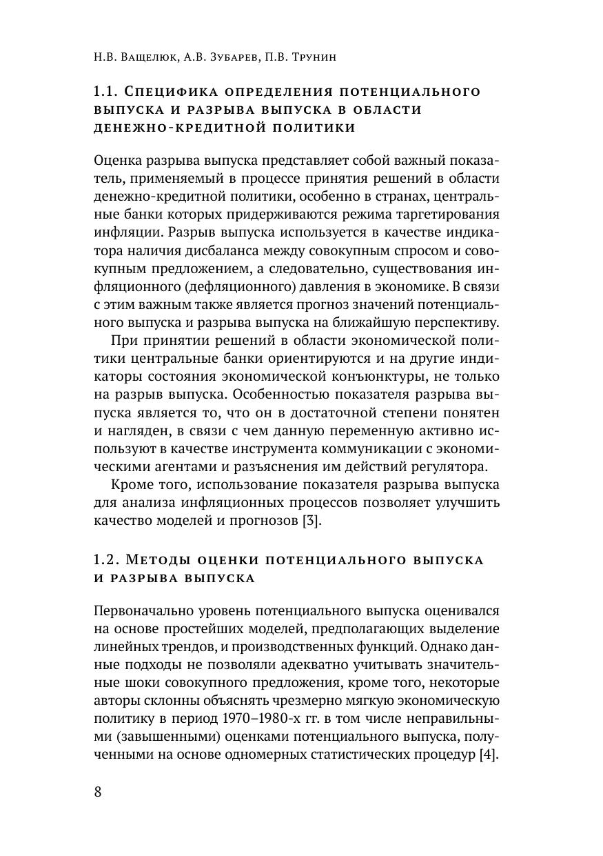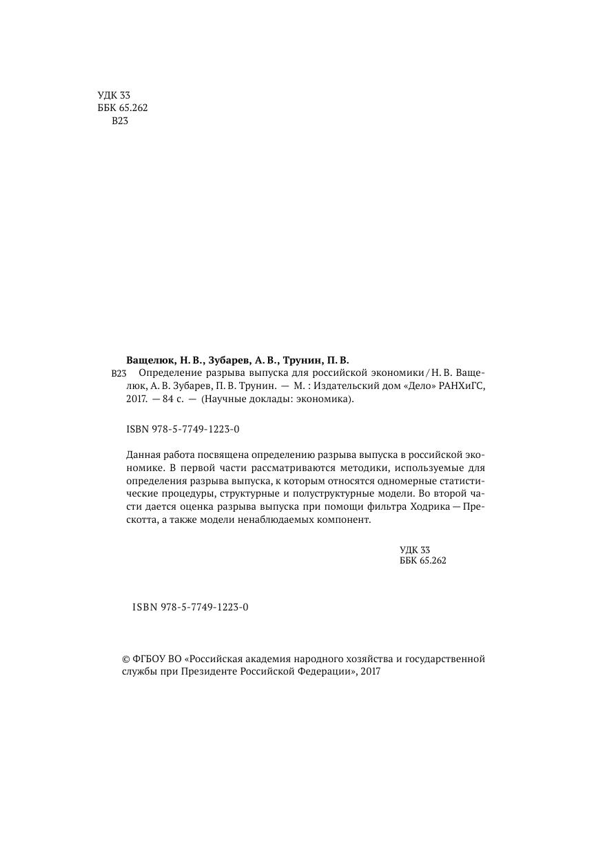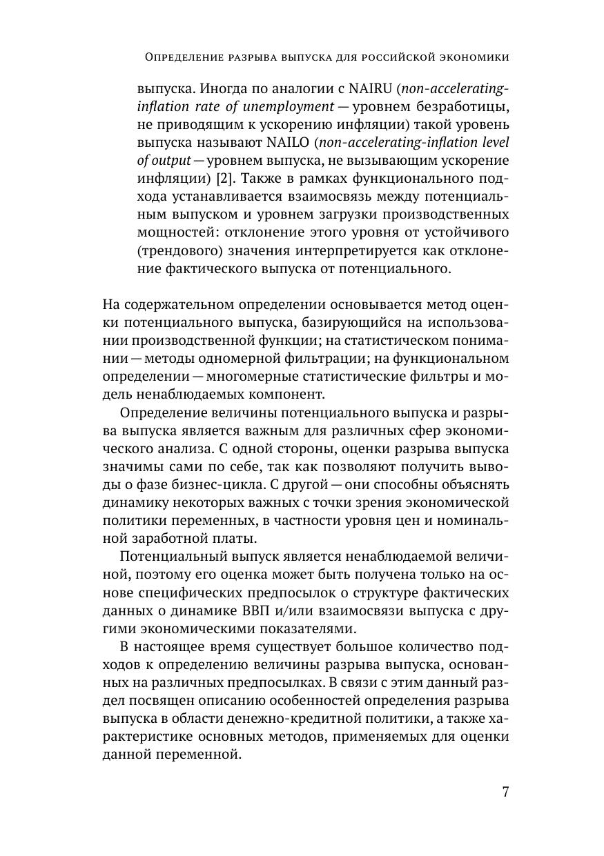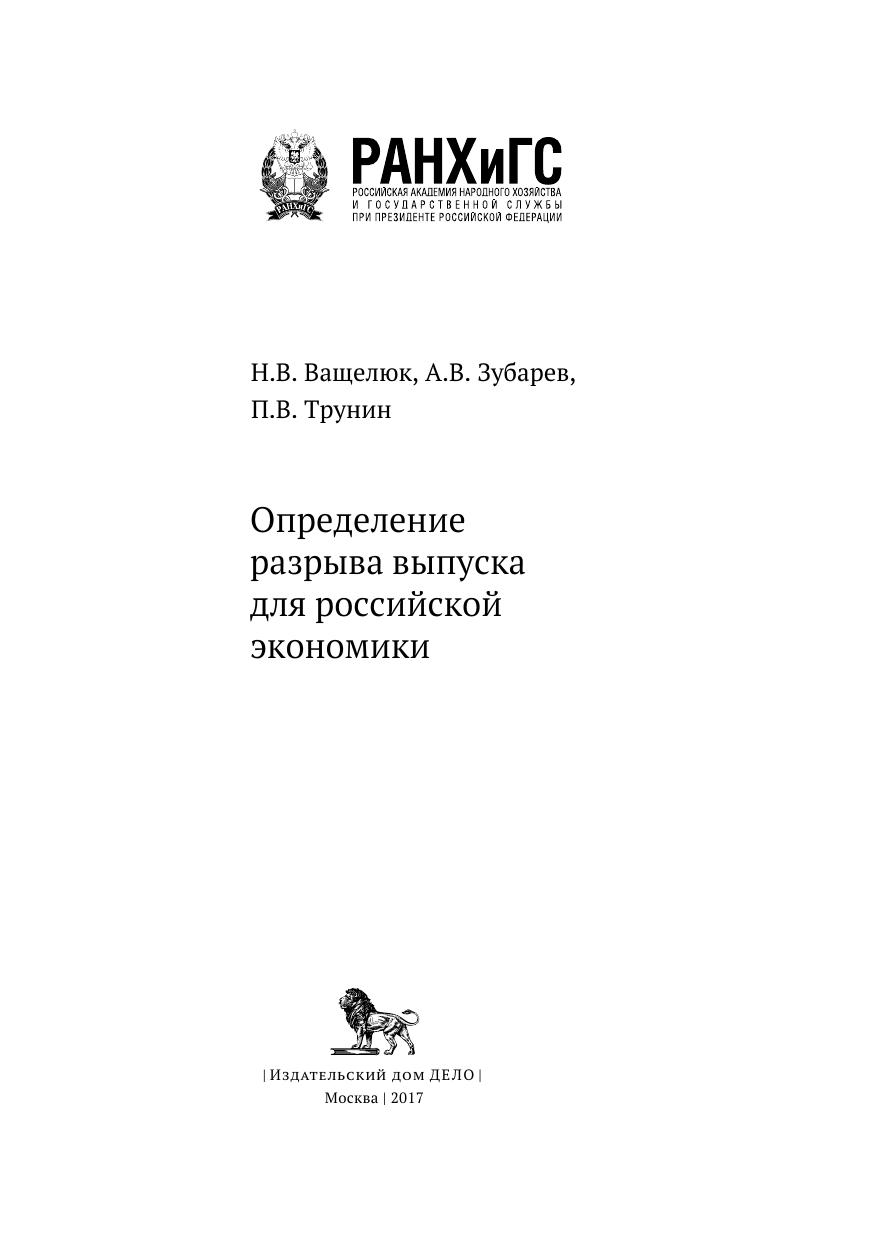 Данная работа посвящена определению разрыва выпуска в российской экономике. В первой части рассматриваются методики, используемые для определения разрыва выпуска, к которым относятся одномерные статистические процедуры, структурные и полуструктурные модели. Во второй части дается оценка разрыва выпуска при помощи фильтра Ходрика — Прескотта, а также модели ненаблюдаемых компонент.