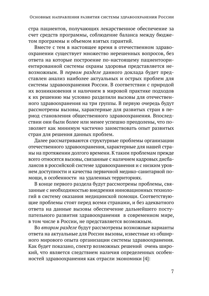 В докладе рассматриваются наиболее острые и актуальные проблемы системы здравоохранения России, среди которых выделены вызовы, характерные для большинства развитых стран в период становления общественного здравоохранения, структурные проблемы, присущие отечественному здравоохранению в течение многих лет, а также новые вызовы, связанные с необходимостью внедрения инновационных медицинских технологий. На основе международного опыта решения сопоставимых проблем проводится анализ целей и задач государственной политики в сфере здравоохранения, поставленных Указом Президента РФ от 7 мая 2018 г. № 204, дается оценка степени их достижимости, соответствия актуальным для нашей страны проблемам.