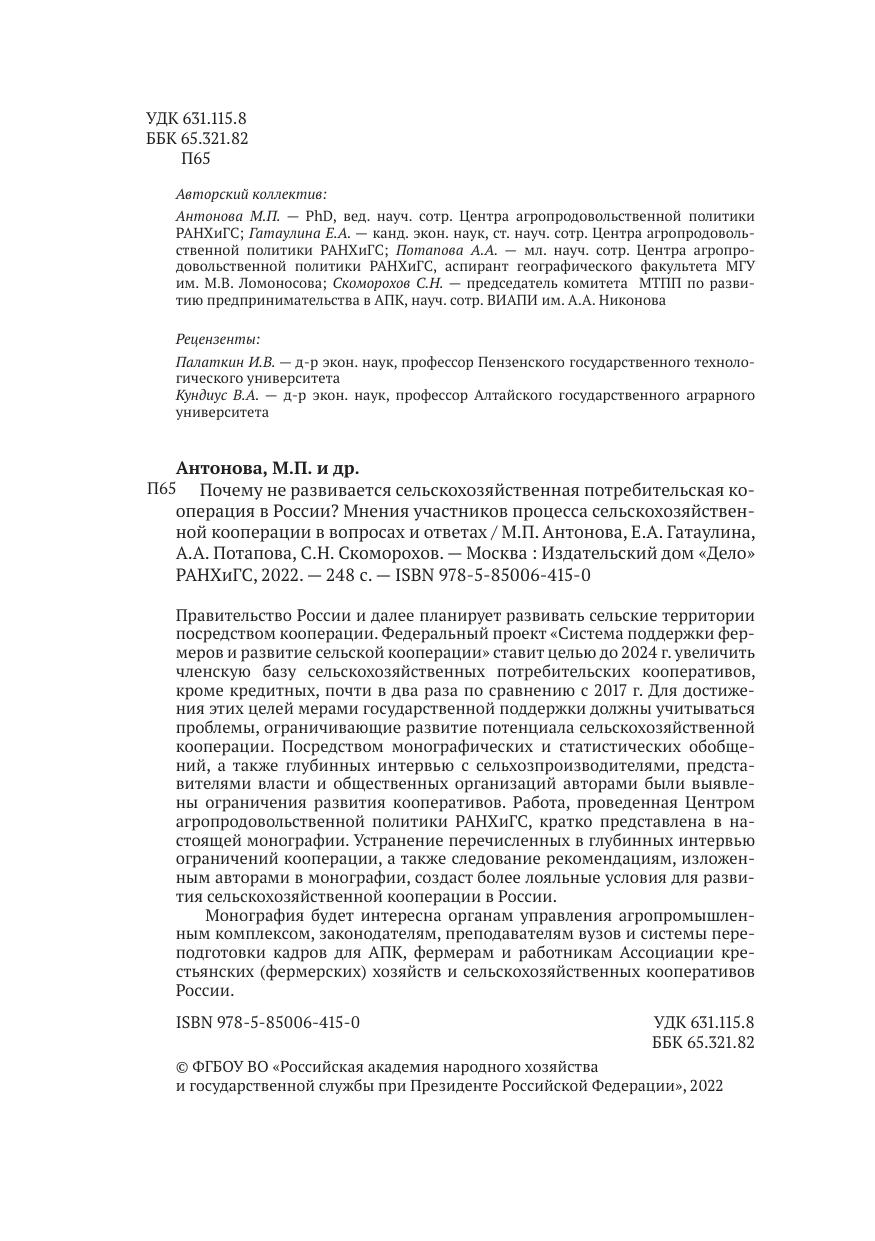Правительство России и далее планирует развивать сельские территории посредством кооперации. Федеральный проект «Система поддержки фермеров и развитие сельской кооперации» ставит целью до 2024 г. увеличить членскую базу сельскохозяйственных потребительских кооперативов, кроме кредитных, почти в два раза по сравнению с 2017 г. Для достижения этих целей мерами государственной поддержки должны учитываться проблемы, ограничивающие развитие потенциала сельскохозяйственной кооперации. Посредством монографических и статистических обобщений, а также глубинных интервью с сельхозпроизводителями, представителями власти и общественных организаций авторами были выявлены ограничения развития кооперативов. Работа, проведенная Центром агропродовольственной политики РАНХиГС, кратко представлена в настоящей монографии. Устранение перечисленных в глубинных интервью ограничений кооперации, а также следование рекомендациям, изложенным авторами в монографии, создаст более лояльные условия для развития сельскохозяйственной кооперации в России. Монография будет интересна органам управления агропромышленным комплексом, законодателям, преподавателям вузов и системы переподготовки кадров для АПК, фермерам и работникам Ассоциации крестьянских (фермерских) хозяйств и сельскохозяйственных кооперативов России.