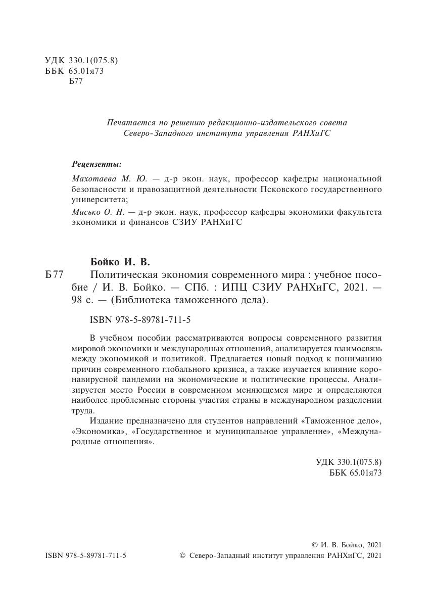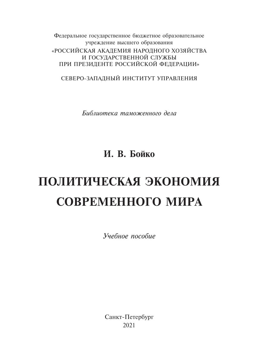 В учебном пособии рассматриваются вопросы современного развития мировой экономики и международных отношений, анализируется взаимосвязь между экономикой и политикой. Предлагается новый подход к пониманию причин современного глобального кризиса, а также изучается влияние коронавирусной пандемии на экономические и политические процессы. Анализируется место России в современном меняющемся мире и определяются наиболее проблемные стороны участия страны в международном разделении труда. Издание предназначено для студентов направлений «Таможенное дело», «Экономика», «Государственное и муниципальное управление», «Международные отношения».