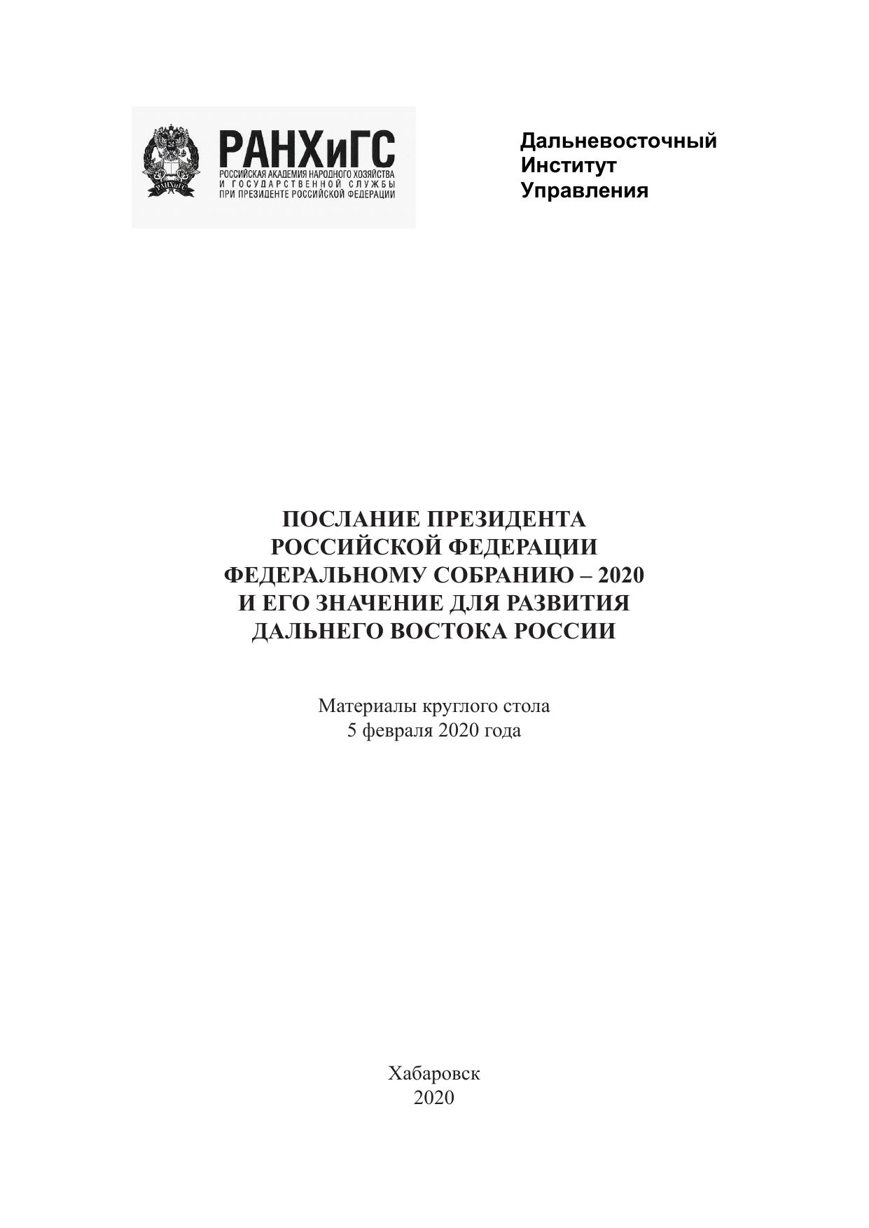 Послание Президента Российской Федерации Федеральному Собранию – 2020 и его значение для развития Дальнего Востока России: материалы круглого стола 5 февраля 2020 года