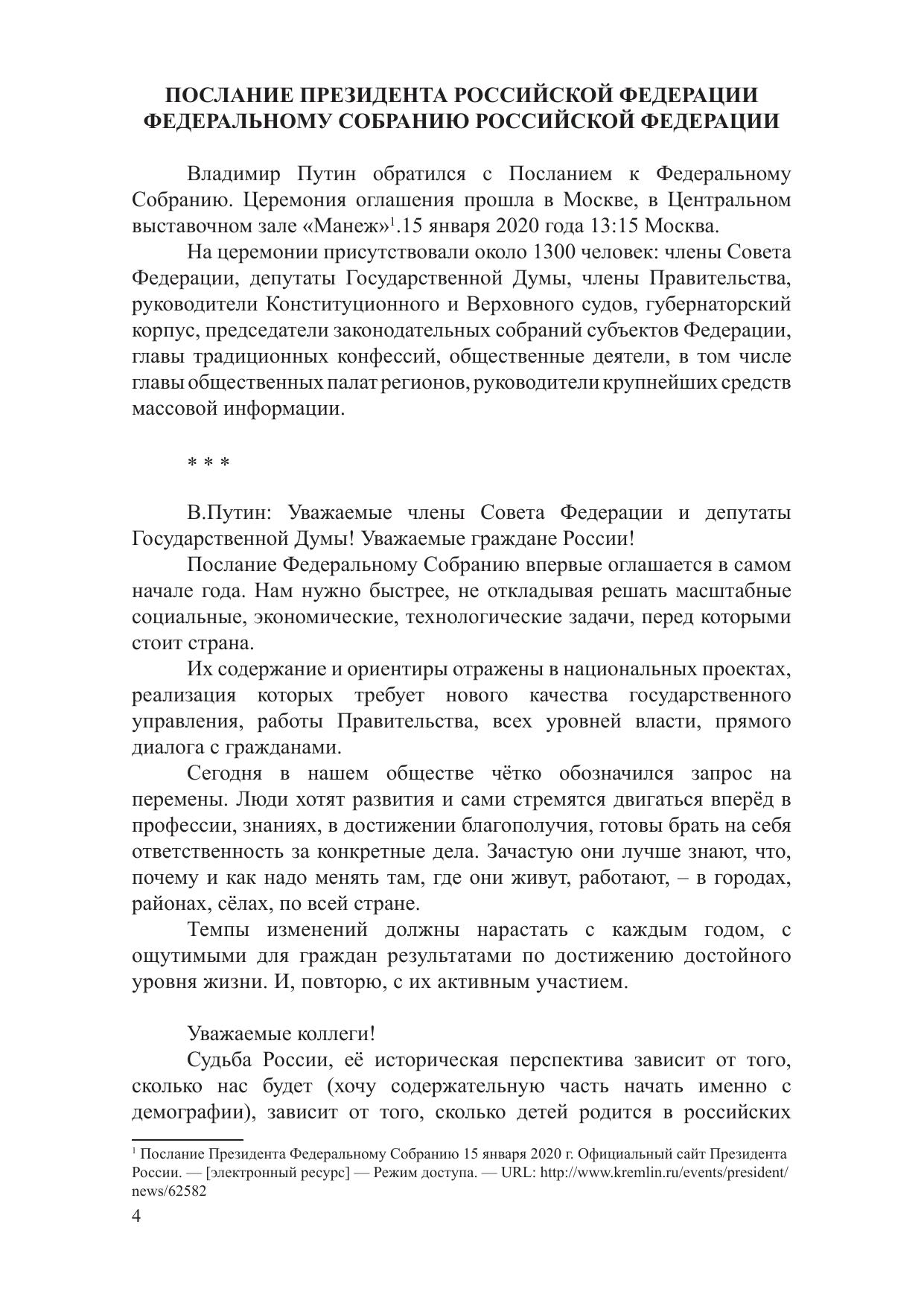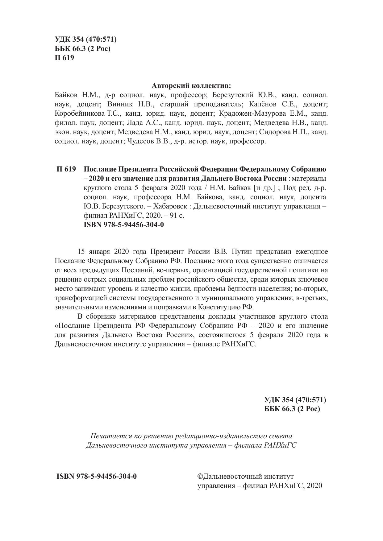 15 января 2020 года Президент России В.В. Путин представил ежегодное Послание Федеральному Собранию РФ. Послание этого года существенно отличается от всех предыдущих Посланий, во-первых, ориентацией государственной политики на решение острых социальных проблем российского общества, среди которых ключевое место занимают уровень и качество жизни, проблемы бедности населения; во-вторых, трансформацией системы государственного и муниципального управления; в-третьих, значительными изменениями и поправками в Конституцию РФ. В сборнике материалов представлены доклады участников круглого стола «Послание Президента РФ Федеральному Собранию РФ – 2020 и его значение для развития Дальнего Востока России», состоявшегося 5 февраля 2020 года в Дальневосточном институте управления – филиале РАНХиГС.