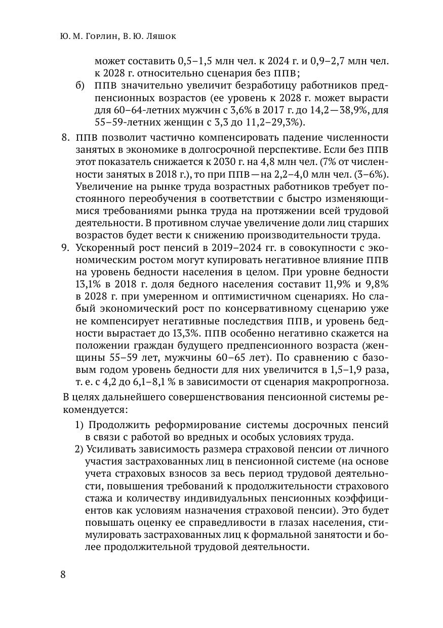 Принятые в ноябре 2018 г. изменения в пенсионном законодательстве, связанные с повышением пенсионного возраста, определяют одно из самых значимых и ответственных решений в социально-экономической сфере, которые принимались за последние десятилетия. Это решение затронет в той или иной степени большинство россиян, скажется на экономике страны и явится вызовом практически для всех социальных институто в. В настоящем докладе представлен базирующийся на ранее выполненных в ИНСАП РАНХиГС работах анализ последствий реализации законодательных норм, принятых в связи с повышением пенсионного возраста для системы обязательного пенсионного страхования, рынка труда, уровня бедности. Формулируются предложения по внесению корректив в пенсионную систему в связи с повышением пенсионного возраста и возможные меры по профилактике связанных с этим рисков.