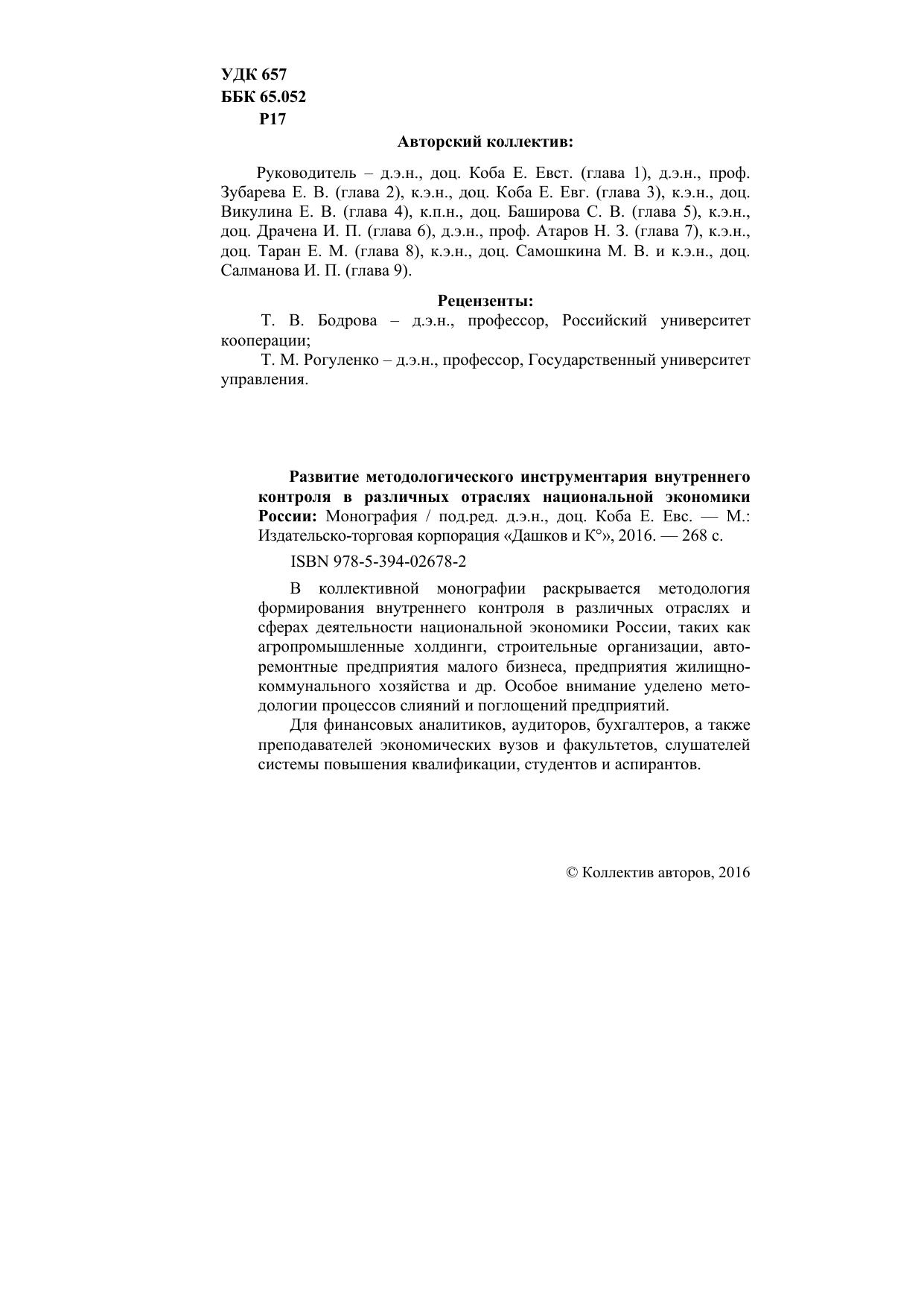 В коллективной монографии раскрывается методология формирования внутреннего контроля в различных отраслях и сферах деятельности национальной экономики России, таких как агропромышленные холдинги, строительные организации, авто-