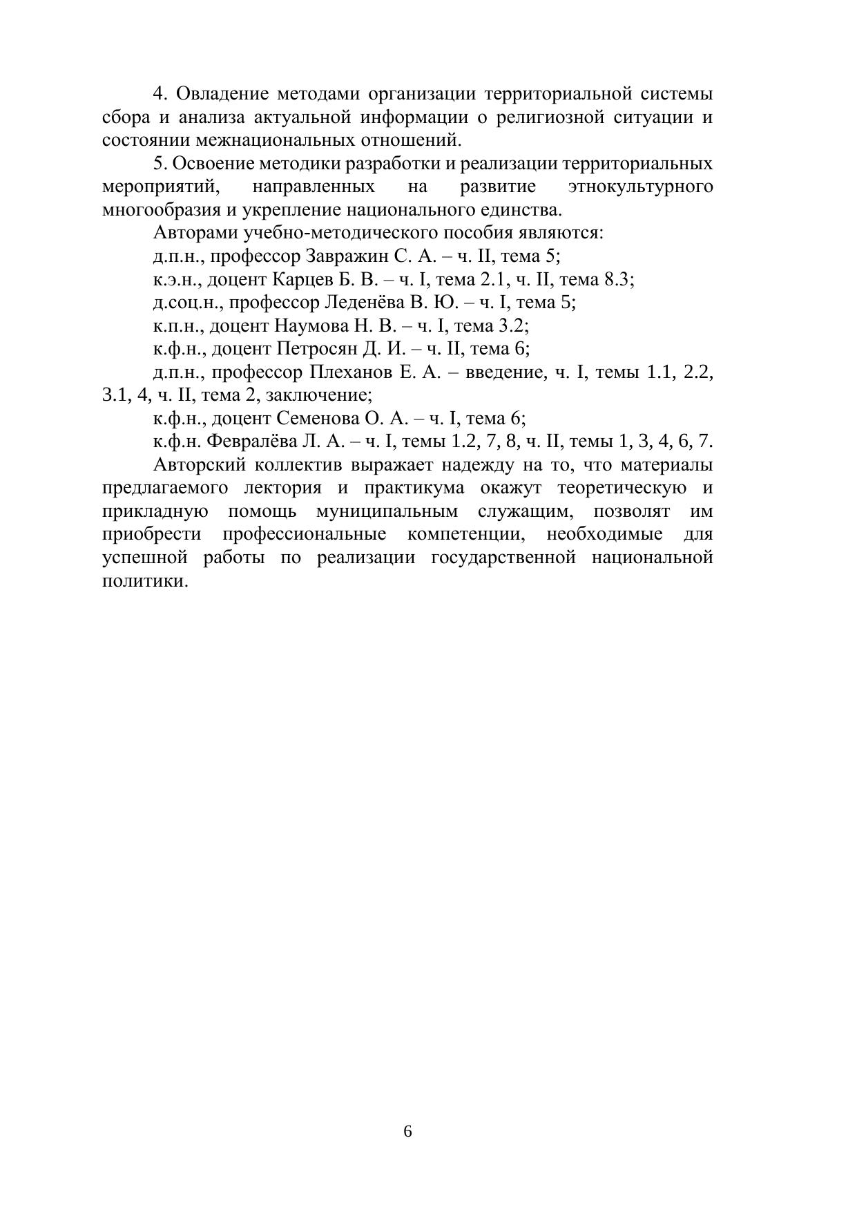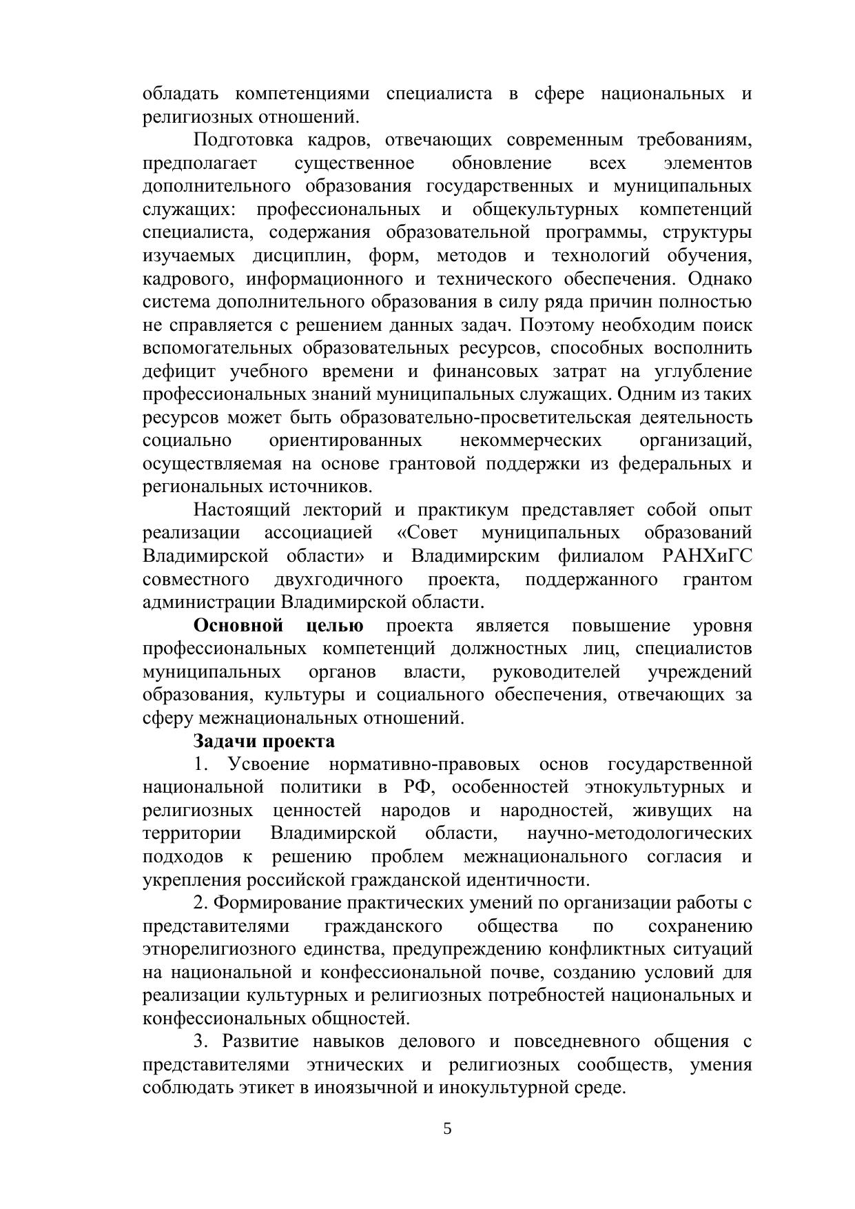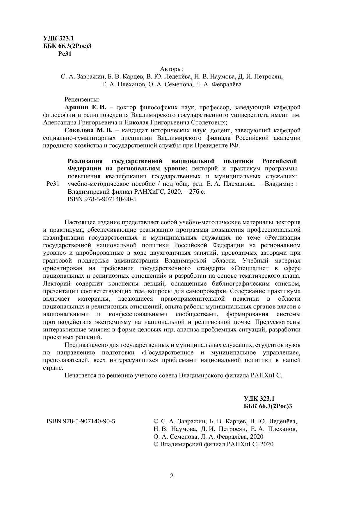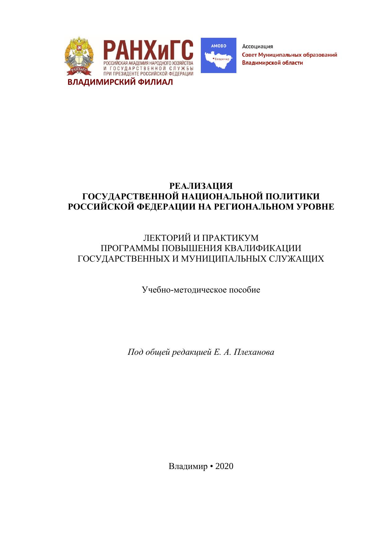 Настоящее издание представляет собой учебно-методические материалы лектория и практикума, обеспечивающие реализацию программы повышения профессиональной квалификации государственных и муниципальных служащих по теме «Реализация государственной национальной политики Российской Федерации на региональном уровне» и апробированные в ходе двухгодичных занятий, проводимых авторами при грантовой поддержке администрации Владимирской области. Учебный материал ориентирован на требования государственного стандарта «Специалист в сфере национальных и религиозных отношений» и разработан на основе тематического плана. Лекторий содержит конспекты лекций, оснащенные библиографическим списком, презентации соответствующих тем, вопросы для самопроверки. Содержание практикума включает материалы, касающиеся правоприменительной практики в области национальных и религиозных отношений, опыта работы муниципальных органов власти с национальными и конфессиональными сообществами, формирования системы противодействия экстремизму на национальной и религиозной почве. Предусмотрены интерактивные занятия в форме деловых игр, анализа проблемных ситуаций, разработки проектных решений. Предназначено для государственных и муниципальных служащих, студентов вузов по направлению подготовки «Государственное и муниципальное управление», преподавателей, всех интересующихся проблемами национальной политики в нашей стране. Печатается по решению ученого совета Владимирского филиала РАНХиГС.