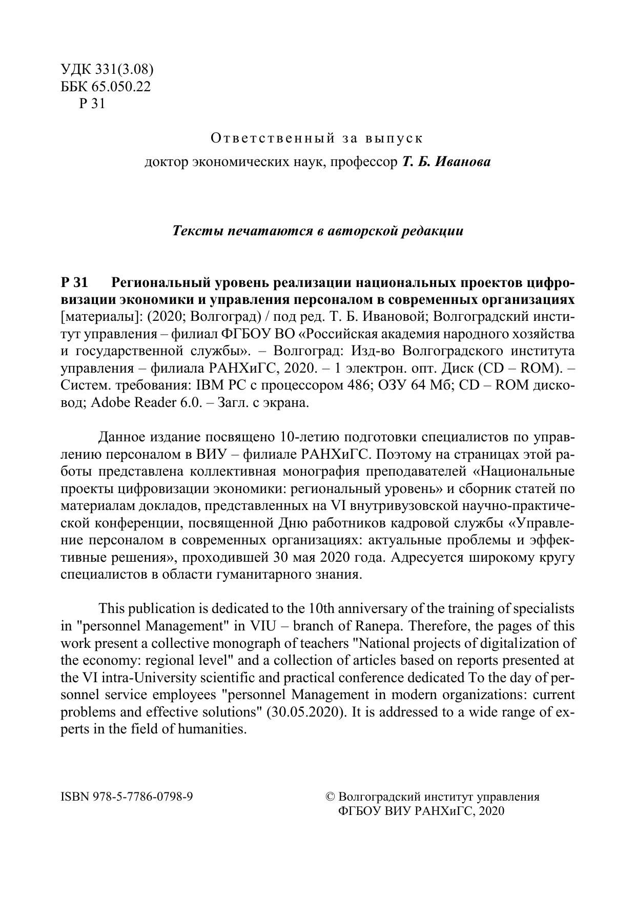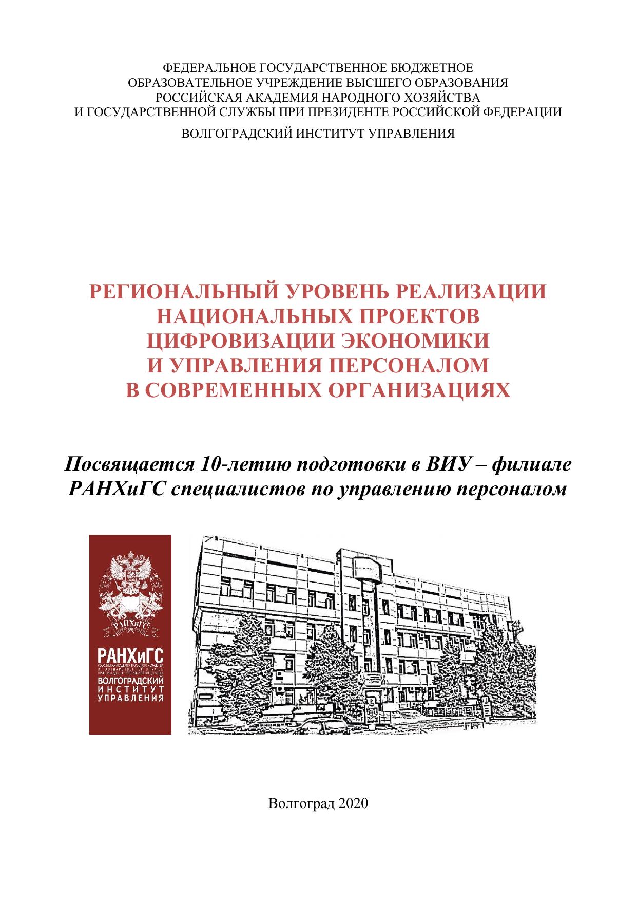 Региональный уровень реализации национальных проектов цифровизации экономики и управления персоналом в современных организациях [материалы]: (2020; Волгоград)