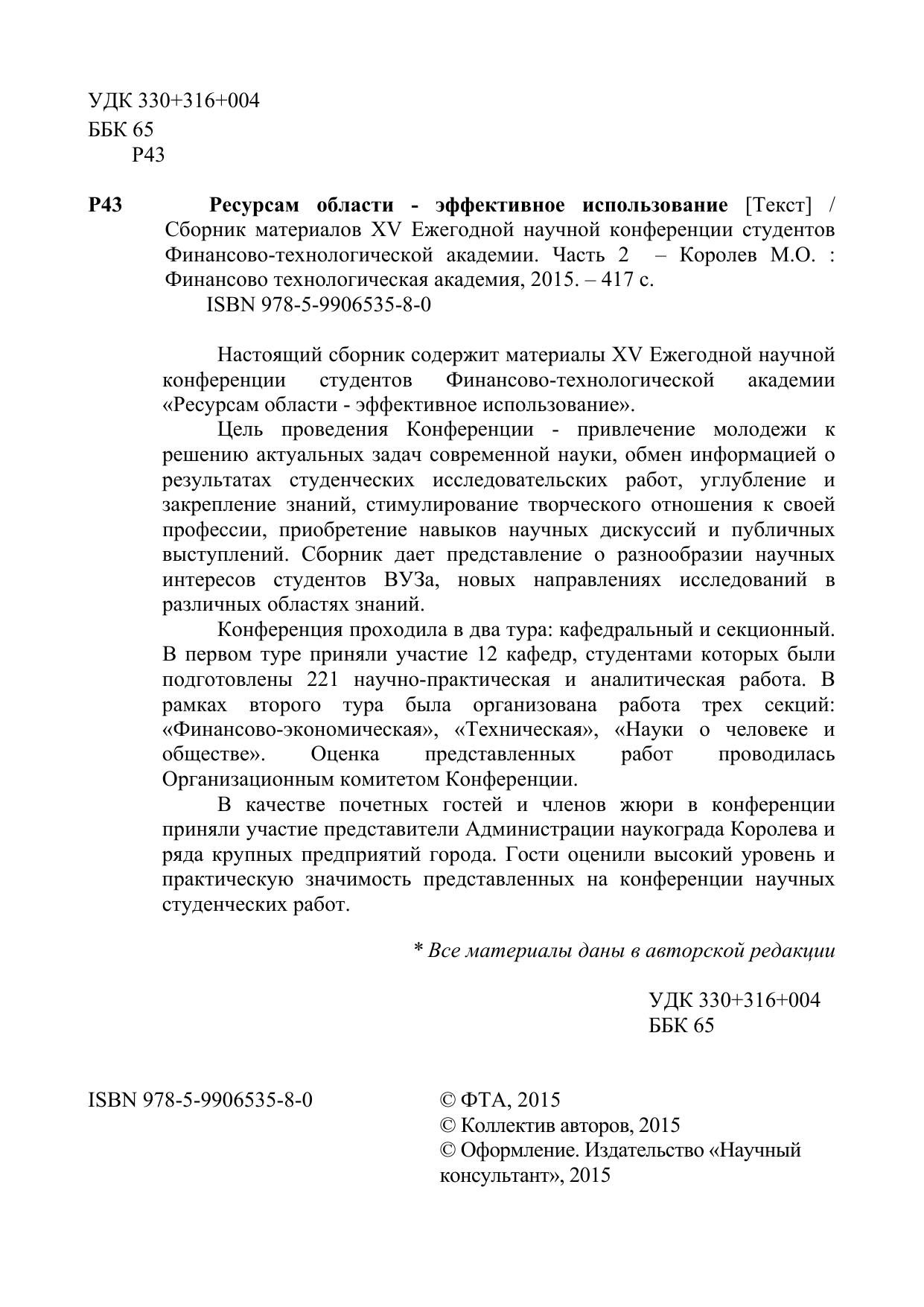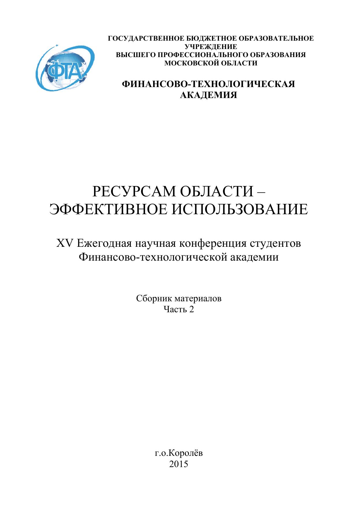 Настоящий сборник содержит материалы XV Ежегодной научной конференции студентов Финансово-технологической академии «Ресурсам области - эффективное использование».