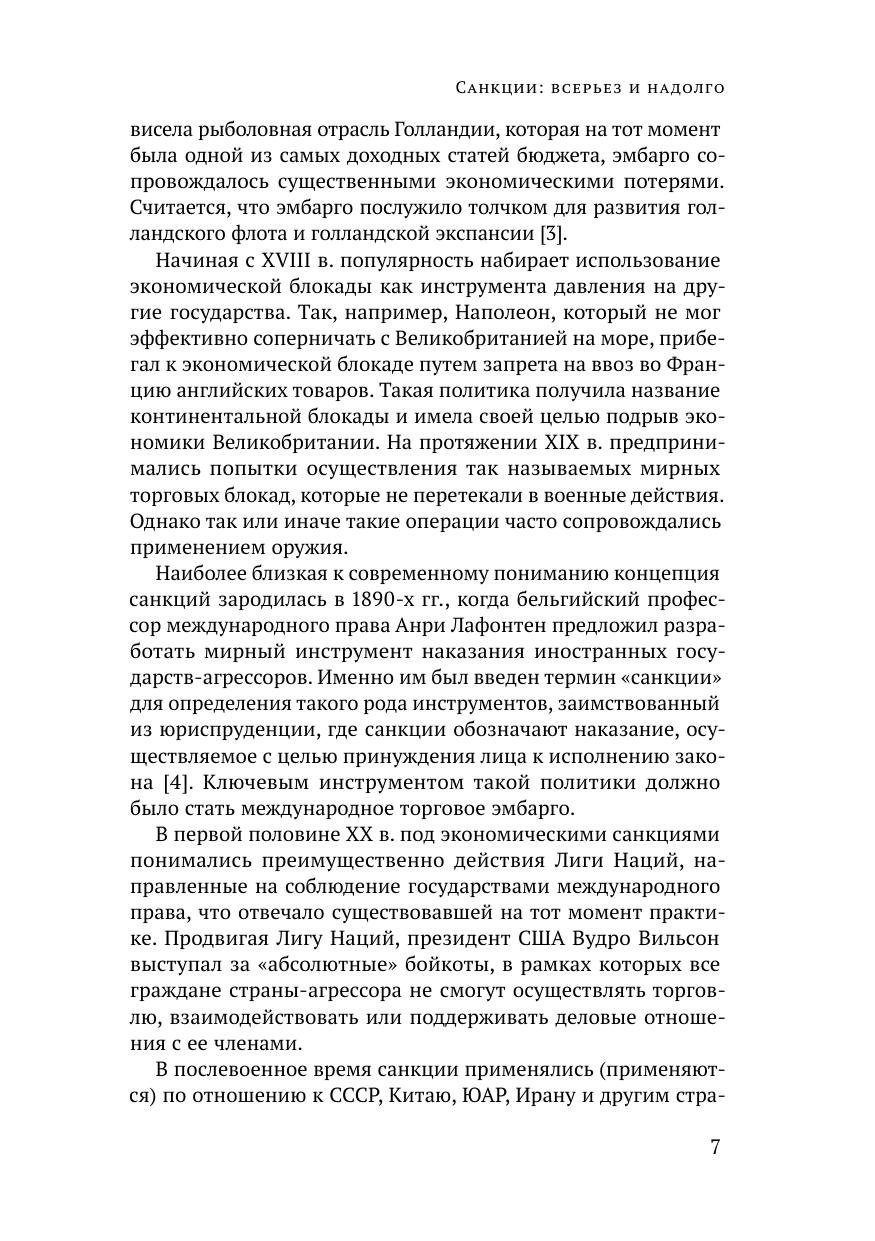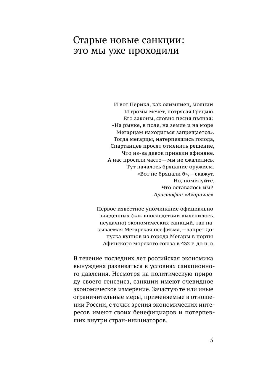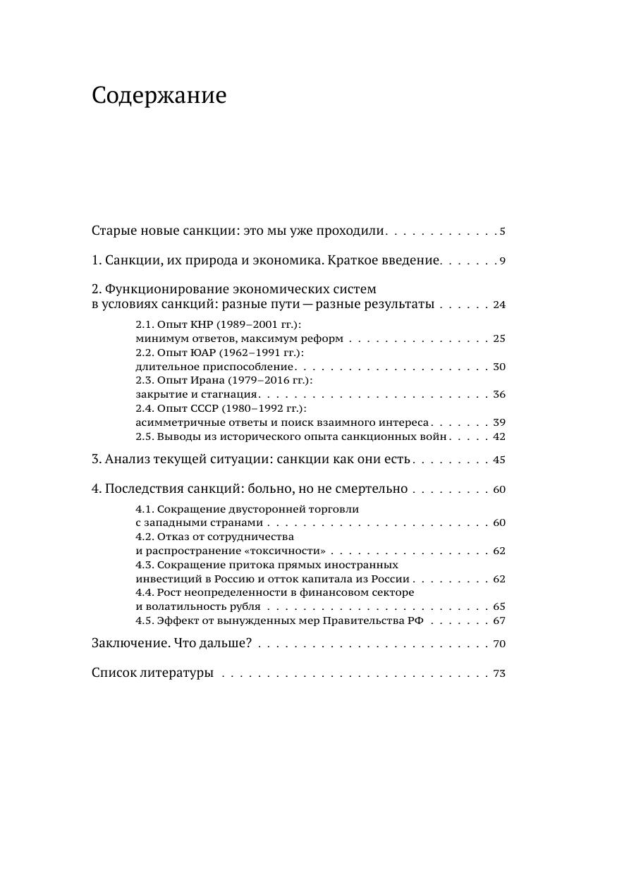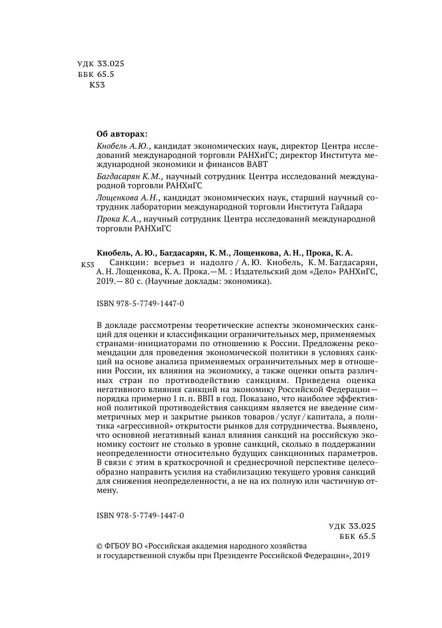 В докладе рассмотрены теоретические аспекты экономических санкций для оценки и классификации ограничительных мер, применяемых странами-инициаторами по отношению к России. Предложены рекомендации для проведения экономической политики в условиях санкций на основе анализа применяемых ограничительных мер в отношении России, их влияния на экономику, а также оценки опыта различных стран по противодействию санкциям. Приведена оценка негативного влияния санкций на экономику Российской Федерации — порядка примерно 1 п. п. ВВП в год. Показано, что наиболее эффективной политикой противодействия санкциям является не введение симметричных мер и закрытие рынков товаров / услуг / капитала, а политика «агрессивной» открытости рынков для сотрудничества. Выявлено, что основной негативный канал влияния санкций на российскую экономику состоит не столько в уровне санкций, сколько в поддержании неопределенности относительно будущих санкционных параметров. В связи с этим в краткосрочной и среднесрочной перспективе целесообразно направить усилия на стабилизацию текущего уровня санкций для снижения неопределенности, а не на их полную или частичную отмену.