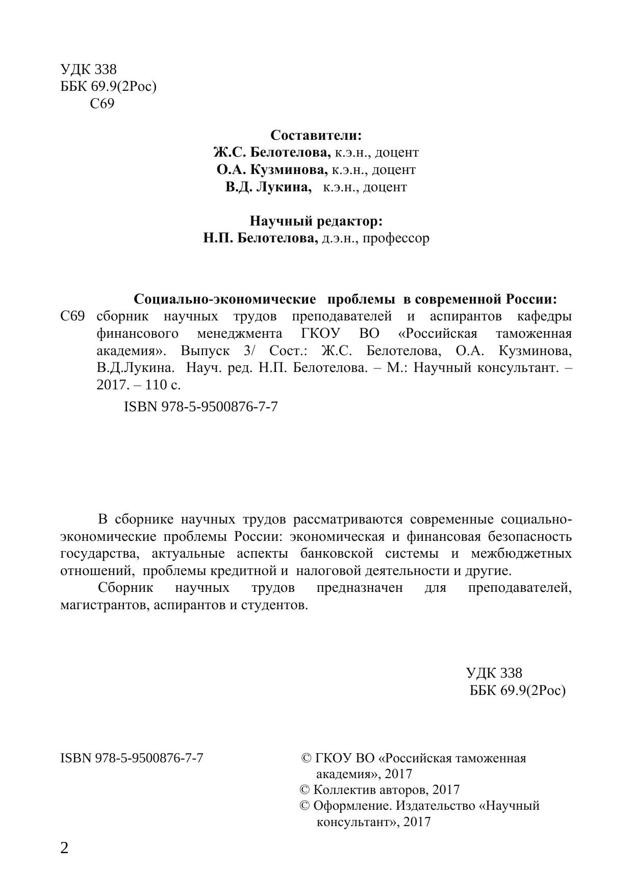 В сборнике научных трудов рассматриваются современные социально-экономические проблемы России: экономическая и финансовая безопасность государства, актуальные аспекты банковской системы и межбюджетных отношений, проблемы кредитной и налоговой деятельности и другие. Сборник научных трудов предназначен для преподавателей, магистрантов, аспирантов и студентов.