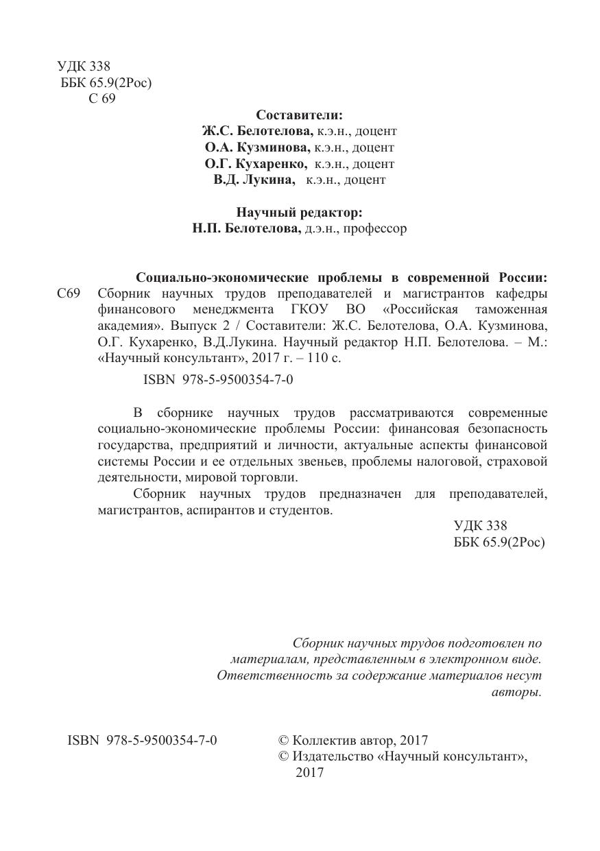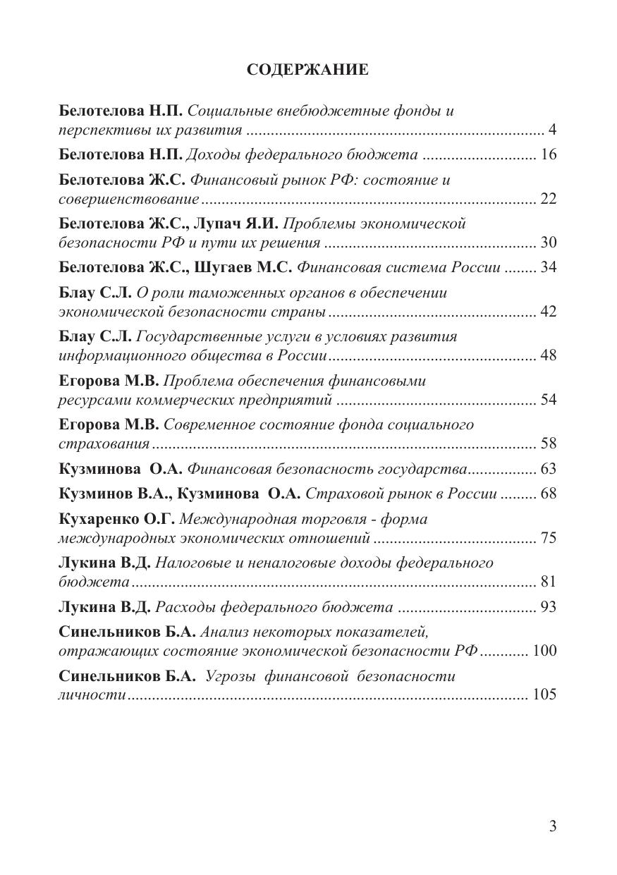 В сборнике научных трудов рассматриваются современные социально-экономические проблемы России: финансовая безопасность государства, предприятий и личности, актуальные аспекты финансовой системы России и ее отдельных звеньев, проблемы налоговой, страховой деятельности, мировой торговли.