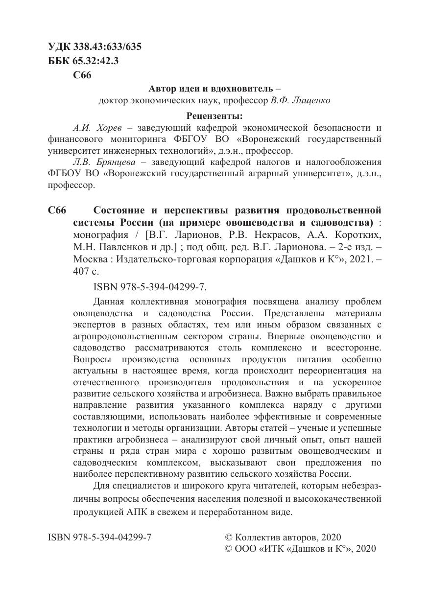 Данная коллективная монография посвящена анализу проблем овощеводства и садоводства России. Представлены материалы экспертов в разных областях, тем или иным образом связанных с агропродовольственным сектором страны. Впервые овощеводство и садоводство рассматриваются столь комплексно и всесторонне. Вопросы производства основных продуктов питания особенно актуальны в настоящее время, когда происходит переориентация на отечественного производителя продовольствия и на ускоренное развитие сельского хозяйства и агробизнеса. Важно выбрать правильное направление развития указанного комплекса наряду с другими составляющими, использовать наиболее эффективные и современные технологии и методы организации. Авторы статей – ученые и успешные практики агробизнеса – анализируют свой личный опыт, опыт нашей страны и ряда стран мира с хорошо развитым овощеводческим и садоводческим комплексом, высказывают свои предложения по наиболее перспективному развитию сельского хозяйства России.
