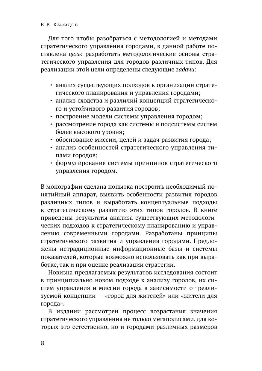 Серия Россия. Вызовы модернизации. Социальная политика. В монографии дается анализ методологических подходов, понятийного аппарата, особенностей развития городов различных типов и выработаны концептуальные подходы к их стратегическому развитию. Проведено сравнение концепций развития города «город для жителей» и «город для людей». Исходя из выбранной концепции и в зависимости от размеров и развития городов обоснованы подходы к построению системы управления и миссии города.