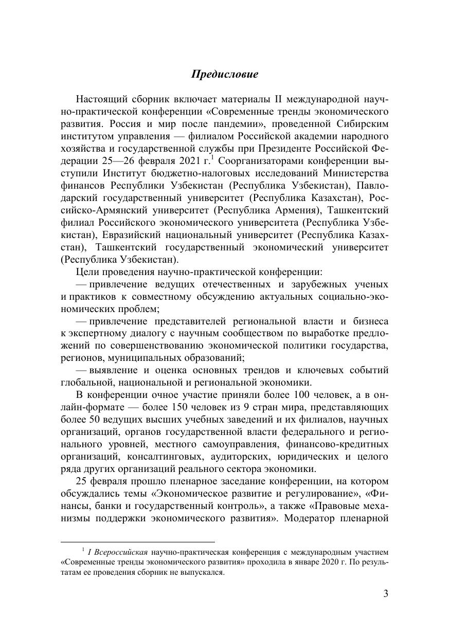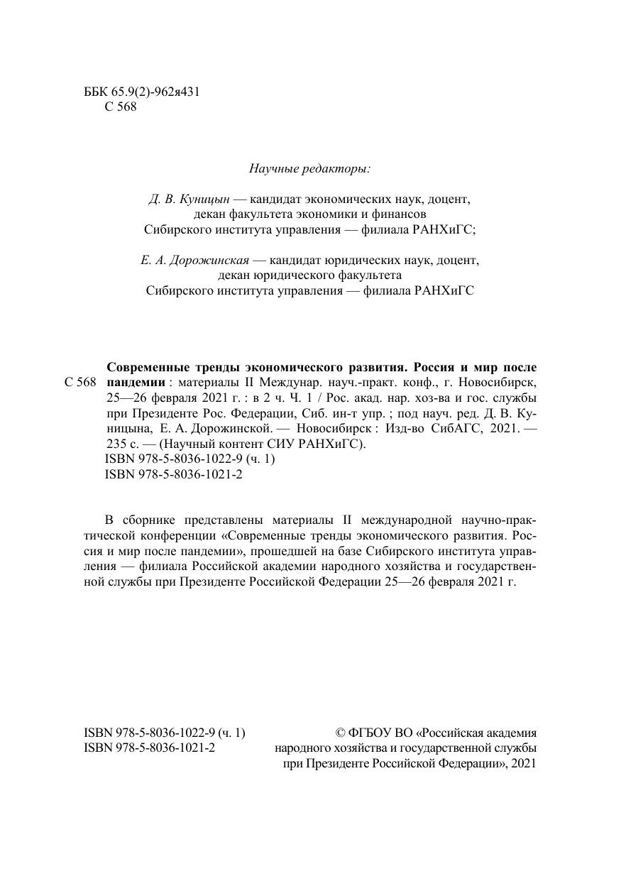 В сборнике представлены материалы II международной научно-прак-тической конференции «Современные тренды экономического развития. Рос-сия и мир после пандемии», прошедшей на базе Сибирского института управ-ления — филиала Российской академии народного хозяйства и государствен-ной службы при Президенте Российской Федерации 25—26 февраля 2021 г.