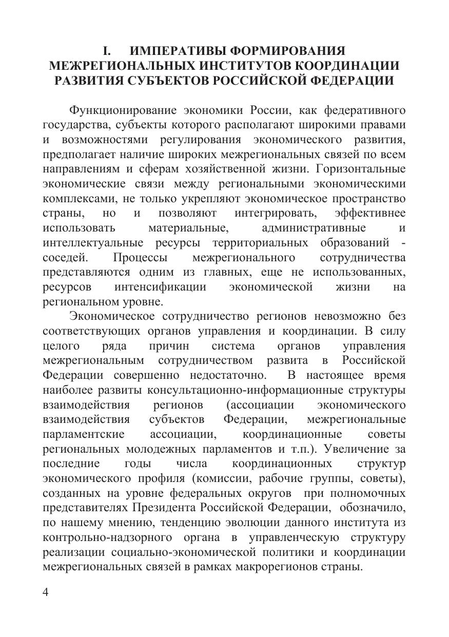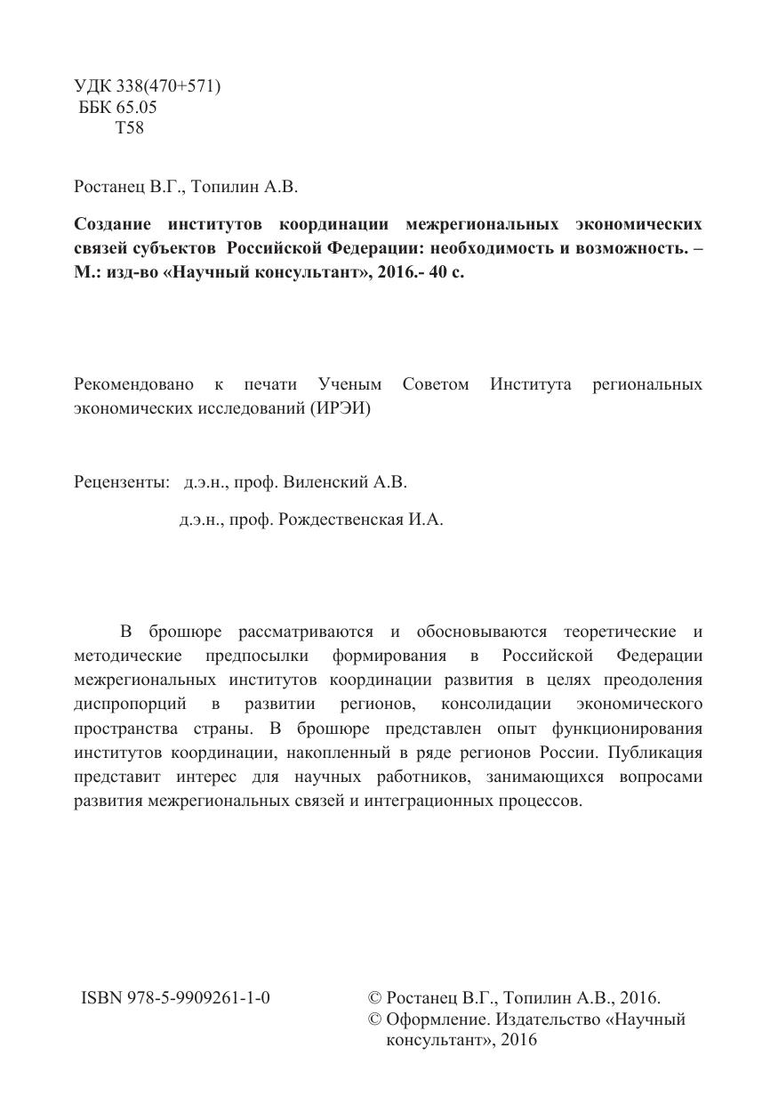 В брошюре рассматриваются и обосновываются теоретические и методические предпосылки формирования в Российской Федерации межрегиональных институтов координации развития в целях преодоления диспропорций в развитии регионов, консолидации экономического пространства страны. В брошюре представлен опыт функционирования институтов координации, накопленный в ряде регионов России. Публикация представит интерес для научных работников, занимающихся вопросами развития межрегиональных связей и интеграционных процессов.