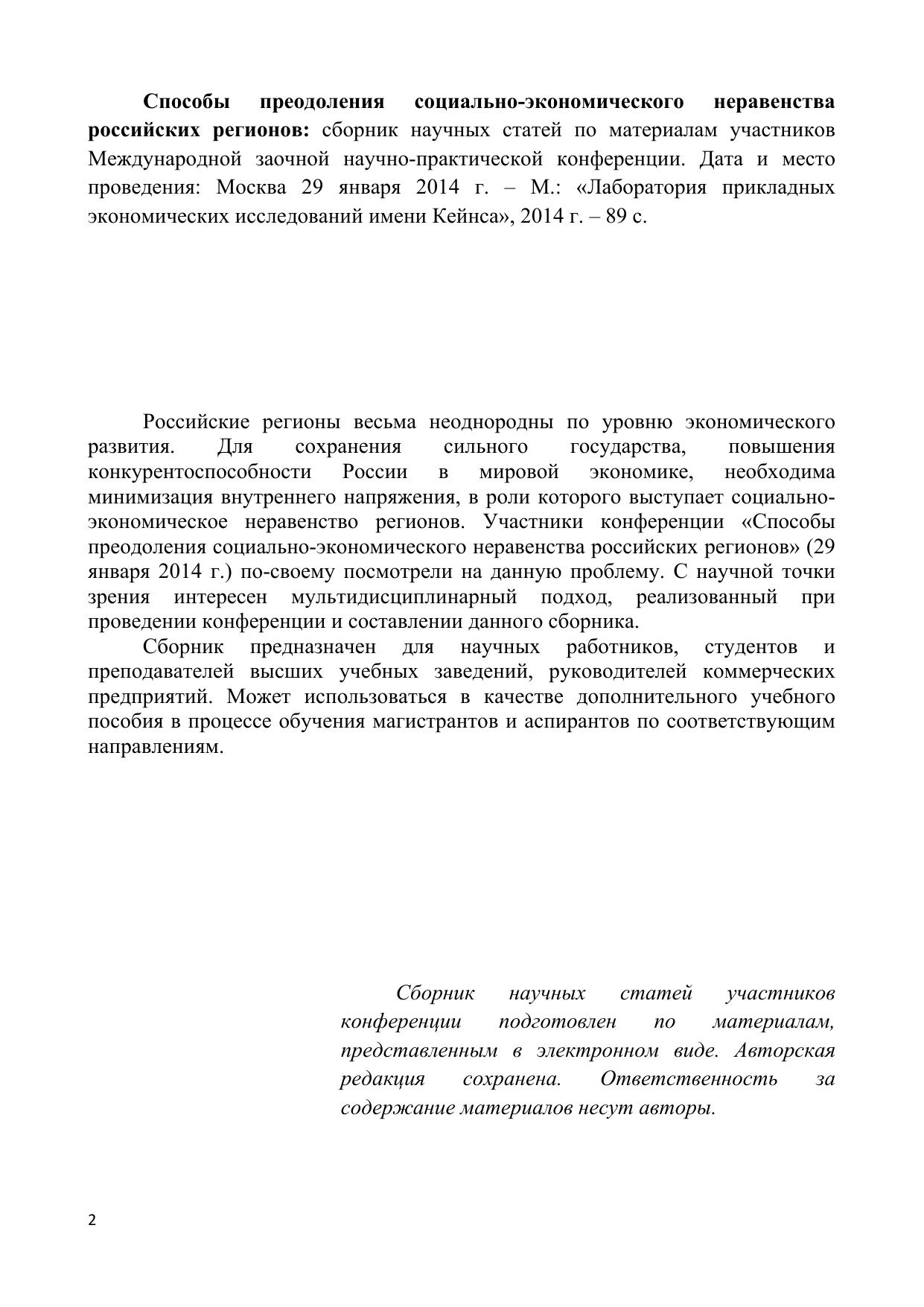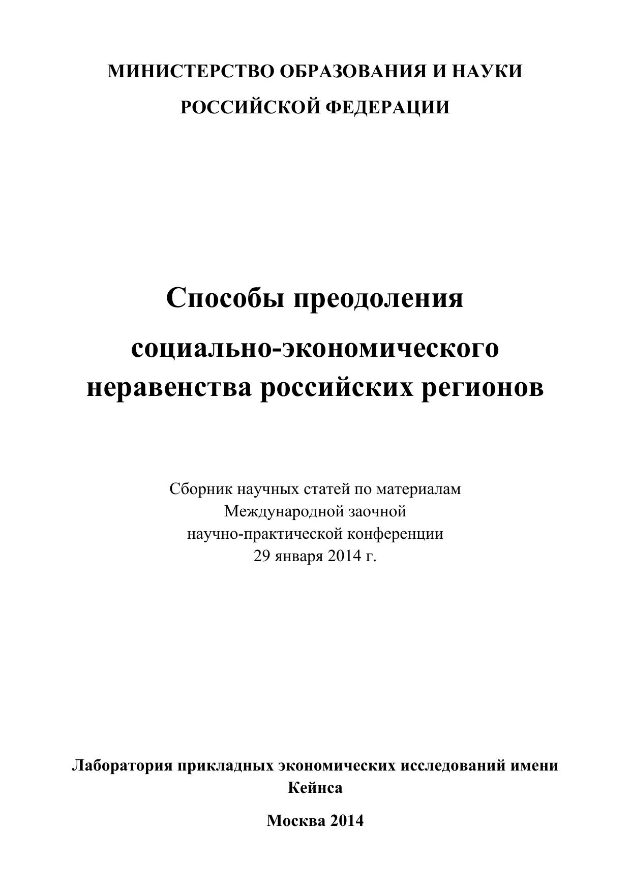 Способы преодоления социально-экономического неравенства российских регионов: сборник научных статей по материалам участников Международной заочной научно-практической конференции