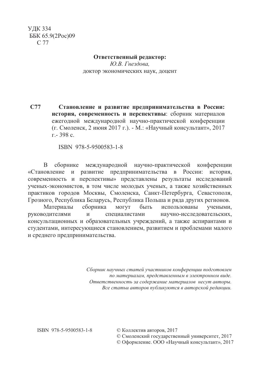 Материалы сборника могут быть использованы учеными, руководителями и специалистами научно-исследовательских, консультационных и образовательных учреждений, а также аспирантами и студентами, интересующиеся становлением, развитием и проблемами малого и среднего предпринимательства.