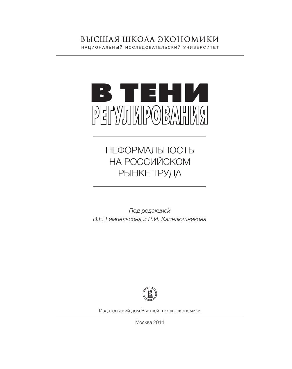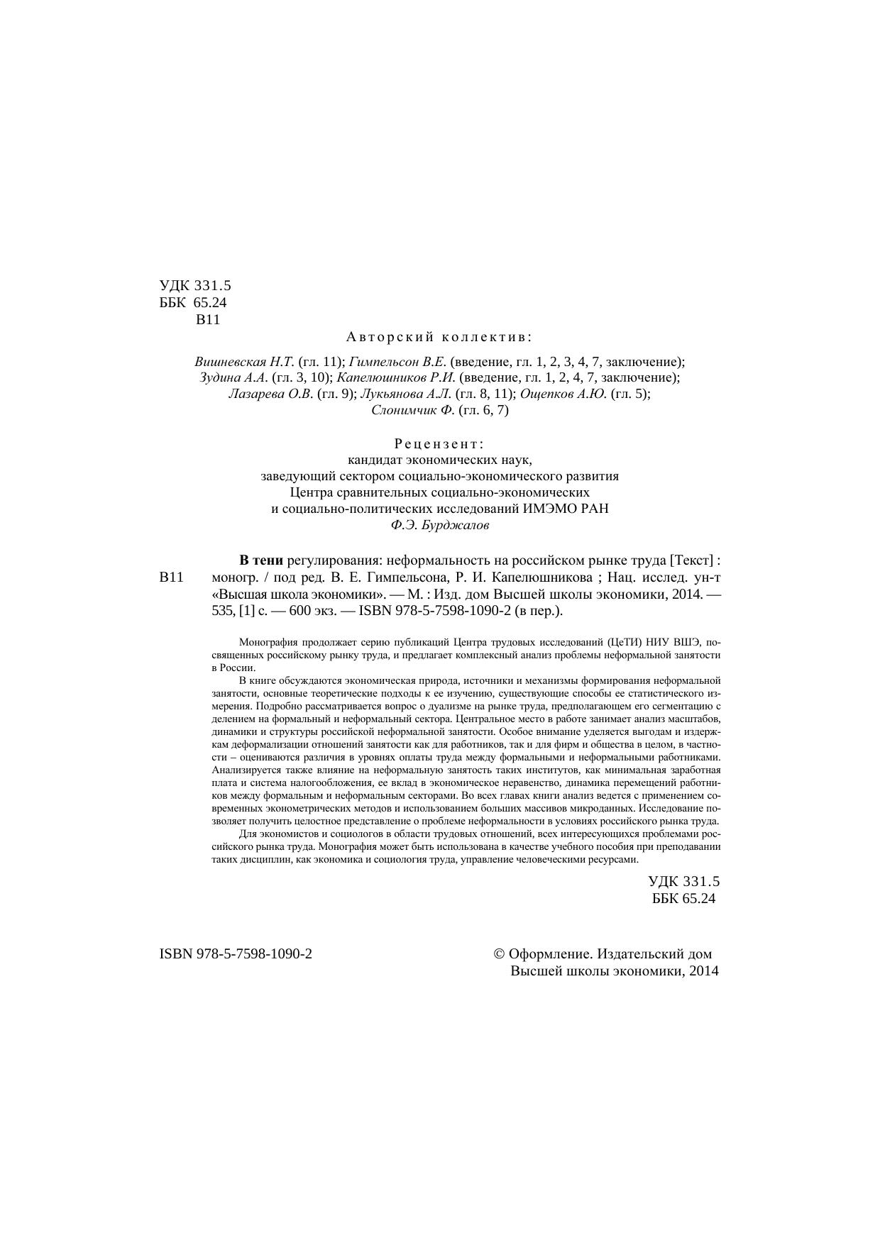 Монография продолжает серию публикаций Центра трудовых исследований (ЦеТИ) НИУ ВШЭ, посвященных российскому рынку труда, и предлагает комплексный анализ проблемы неформальной занятости в России. В книге обсуждаются экономическая природа, источники и механизмы формирования неформальной занятости, основные теоретические подходы к ее изучению, существующие способы ее статистического измерения. Подробно рассматривается вопрос о дуализме на рынке труда, предполагающем его сегментацию с делением на формальный и неформальный сектора. Центральное место в работе занимает анализ масштабов, динамики и структуры российской неформальной занятости. Особое внимание уделяется выгодам и издержкам деформализации отношений занятости как для работников, так и для фирм и общества в целом, в частности – оцениваются различия в уровнях оплаты труда между формальными и неформальными работниками. Анализируется также влияние на неформальную занятость таких институтов, как минимальная заработная плата и система налогообложения, ее вклад в экономическое неравенство, динамика перемещений работников между формальным и неформальным секторами. Во всех главах книги анализ ведется с применением современных эконометрических методов и использованием больших массивов микроданных. Исследование позволяет получить целостное представление о проблеме неформальности в условиях российского рынка труда. Для экономистов и социологов в области трудовых отношений, всех интересующихся проблемами российского рынка труда. Монография может быть использована в качестве учебного пособия при преподавании