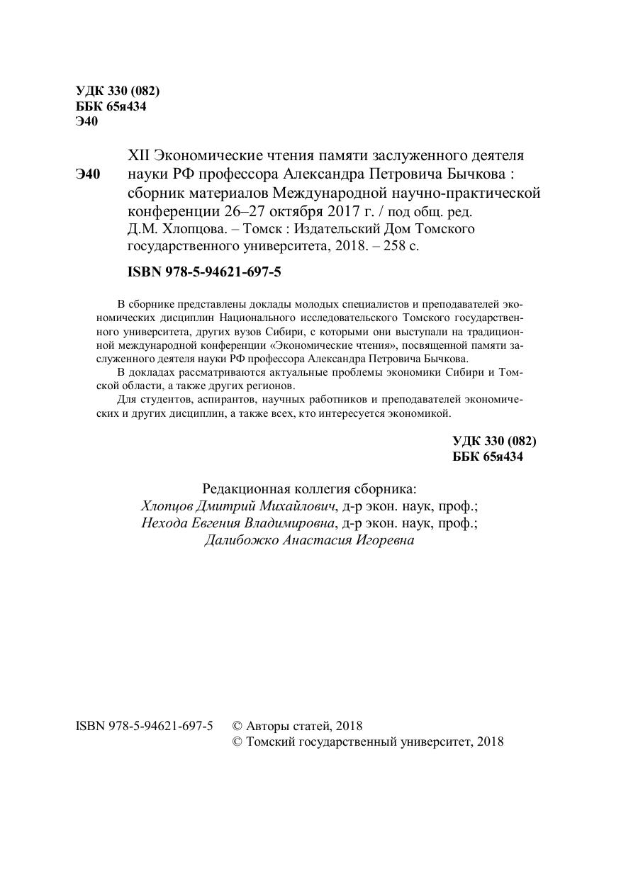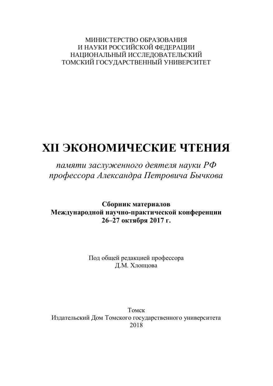 В сборнике представлены доклады молодых специалистов и преподавателей экономических дисциплин Национального исследовательского Томского государственного университета, других вузов Сибири, с которыми они выступали на традиционной международной конференции «Экономические чтения», посвященной памяти заслуженного деятеля науки РФ профессора Александра Петровича Бычкова. В докладах рассматриваются актуальные проблемы экономики Сибири и Томской области, а также других регионов. Для студентов, аспирантов, научных работников и преподавателей экономических и других дисциплин, а также всех, кто интересуется экономикой.