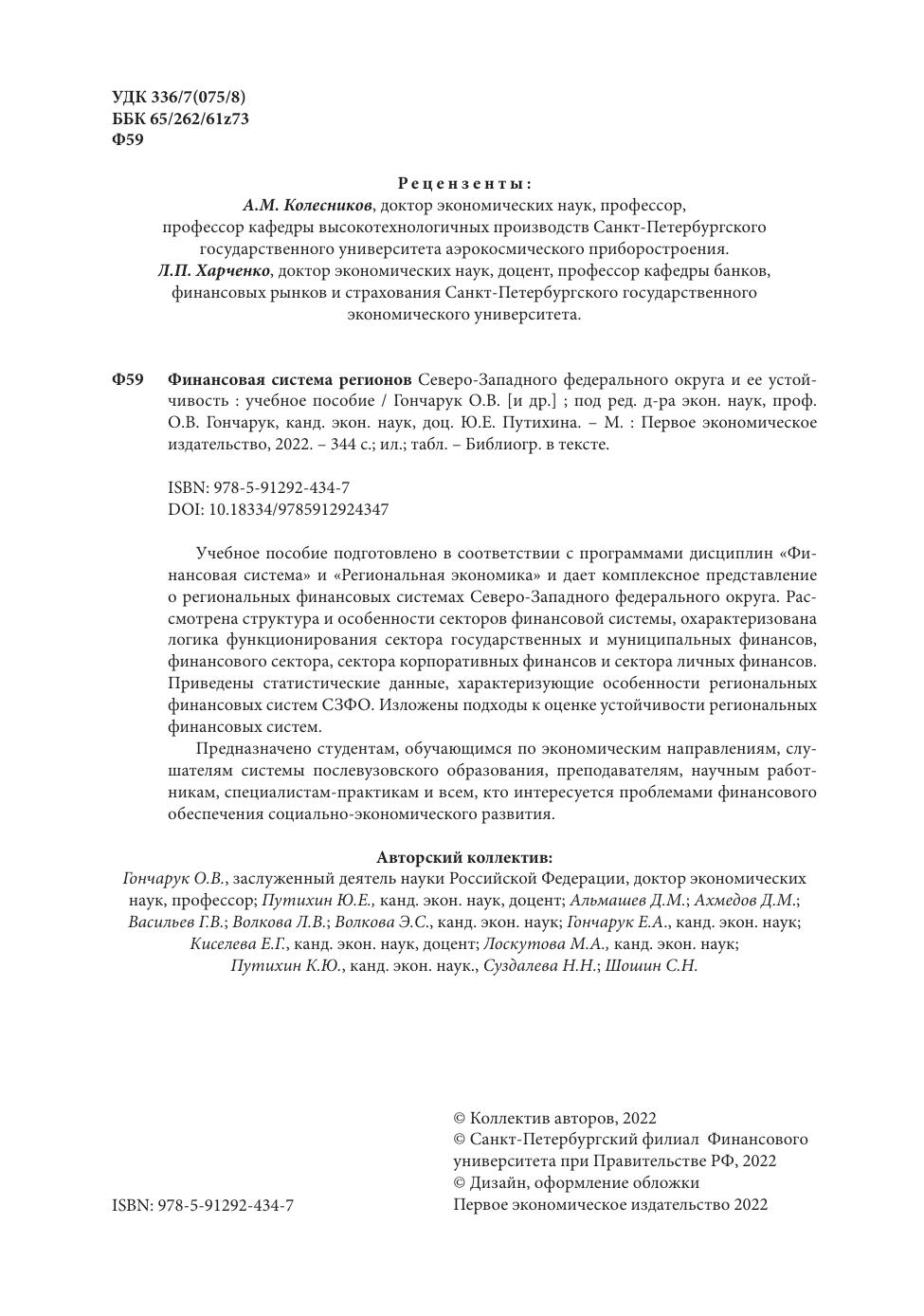 Учебное пособие подготовлено в соответствии с программами дисциплин «Финансовая система» и «Региональная экономика» и дает комплексное представление о региональных финансовых системах Северо-Западного федерального округа. Рассмотрена структура и особенности секторов финансовой системы, охарактеризована логика функционирования сектора государственных и муниципальных финансов, финансового сектора, сектора корпоративных финансов и сектора личных финансов. Приведены статистические данные, характеризующие особенности региональных финансовых систем СЗФО. Изложены подходы к оценке устойчивости региональных финансовых систем. Предназначено студентам, обучающимся по экономическим направлениям, слушателям системы послевузовского образования, преподавателям, научным работникам, специалистам-практикам и всем, кто интересуется проблемами финансового обеспечения социально-экономического развития.