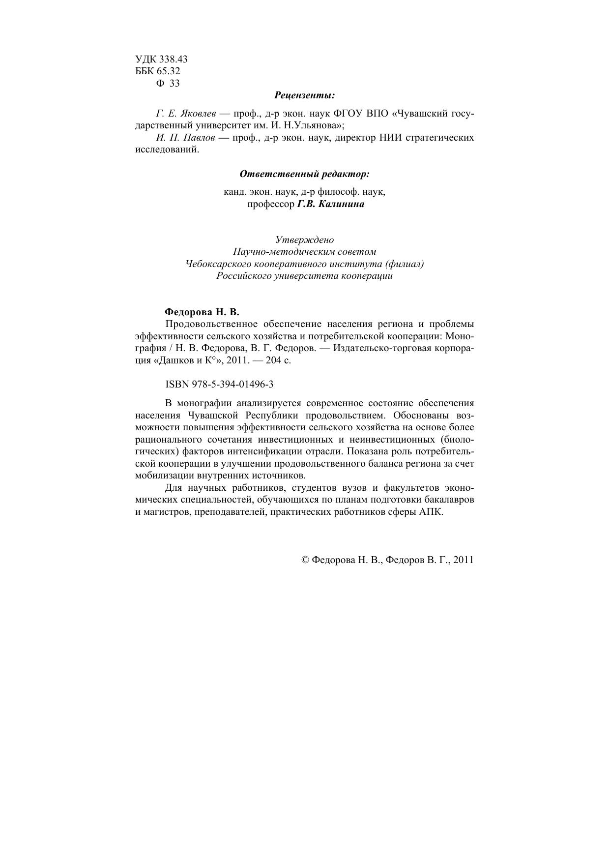 В монографии анализируется современное состояние обеспечения населения Чувашской Республики продовольствием. Обоснованы возможности повышения эффективности сельского хозяйства на основе более рационального сочетания инвестиционных и неинвестиционных (биологических) факторов интенсификации отрасли. Показана роль потребительской кооперации в улучшении продовольственного баланса региона за счет мобилизации внутренних источников.