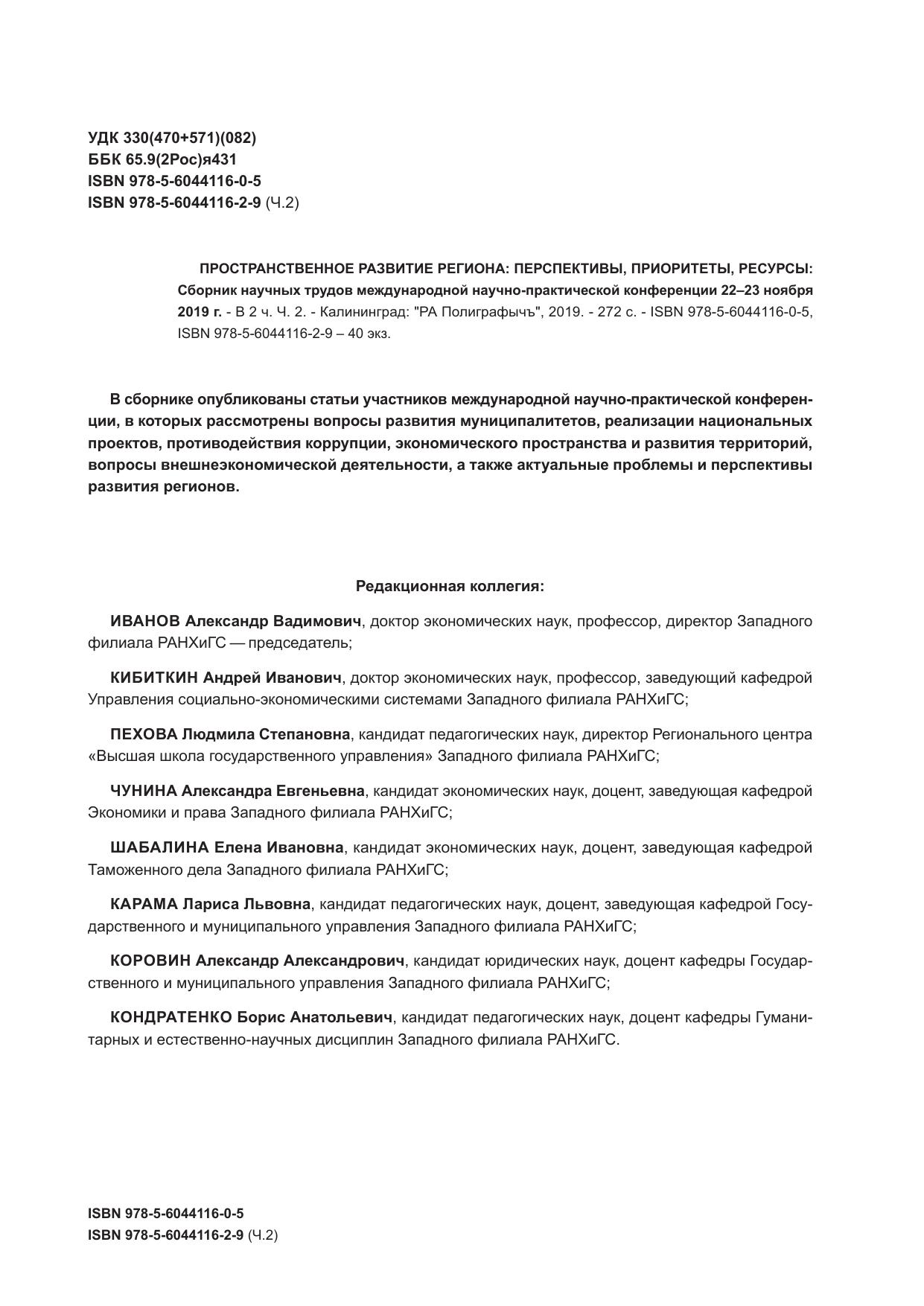 Пространственное развитие региона: перспективы, приоритеты, ресурсы: Сборник научных трудов международной научно-практической конференции 22–23 ноября 2019 г. - В 2 ч. Ч. 2