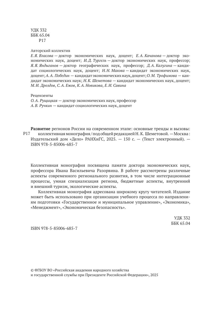 Коллективная монография посвящена памяти доктора экономических наук, профессора Ивана Васильевича Разорвина. В работе рассмотрены различные аспекты современного регионального развития, в том числе интеграционные процессы, умная специализация региона, бюджетные аспекты, внутренний и внешний туризм, экологические аспекты. Коллективная монография адресована широкому кругу читателей. Издание может быть использовано при организации учебного процесса по направлениям подготовки «Государственное и муниципальное управление», «Экономика», «Менеджмент», «Экономическая безопасность».