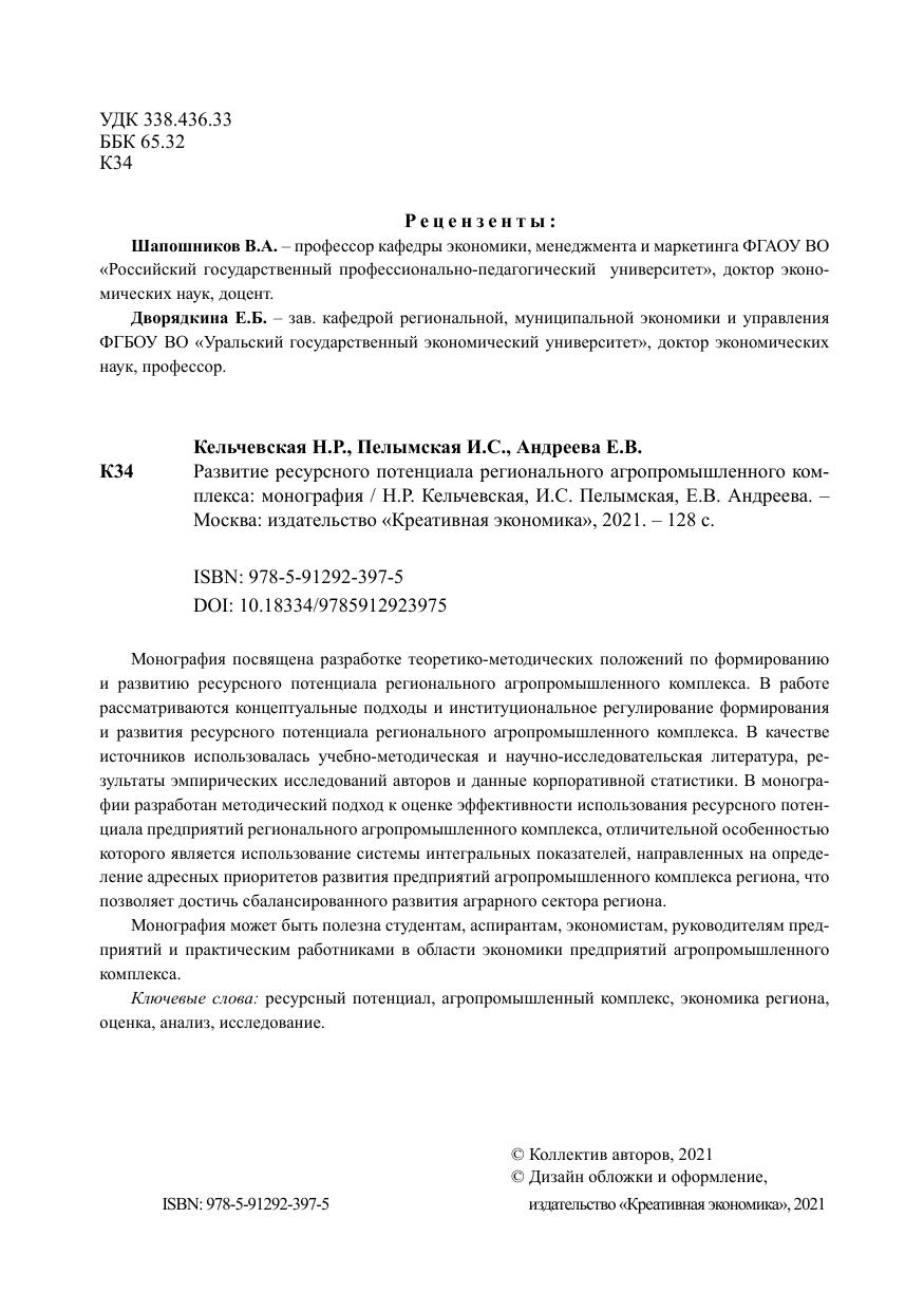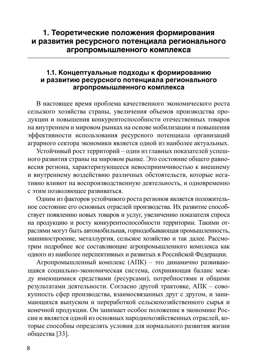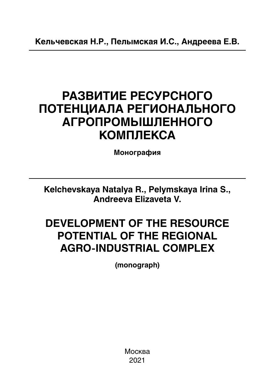 Монография посвящена разработке теоретико-методических положений по формированию и развитию ресурсного потенциала регионального агропромышленного комплекса. В работе рассматриваются концептуальные подходы и институциональное регулирование формирования и развития ресурсного потенциала регионального агропромышленного комплекса. В качестве источников использовалась учебно-методическая и научно-исследовательская литература, результаты эмпирических исследований авторов и данные корпоративной статистики. В монографии разработан методический подход к оценке эффективности использования ресурсного потенциала предприятий регионального агропромышленного комплекса, отличительной особенностью которого является использование системы интегральных показателей, направленных на определение адресных приоритетов развития предприятий агропромышленного комплекса региона, что позволяет достичь сбалансированного развития аграрного сектора региона.
