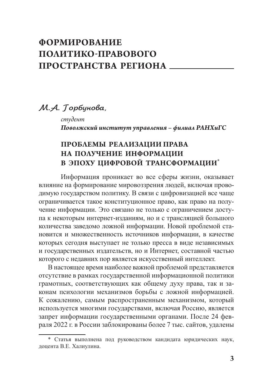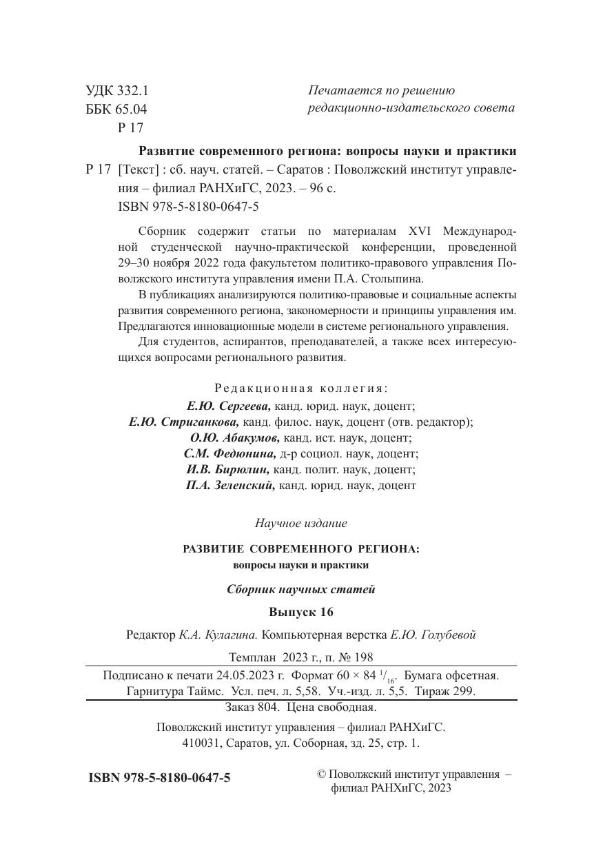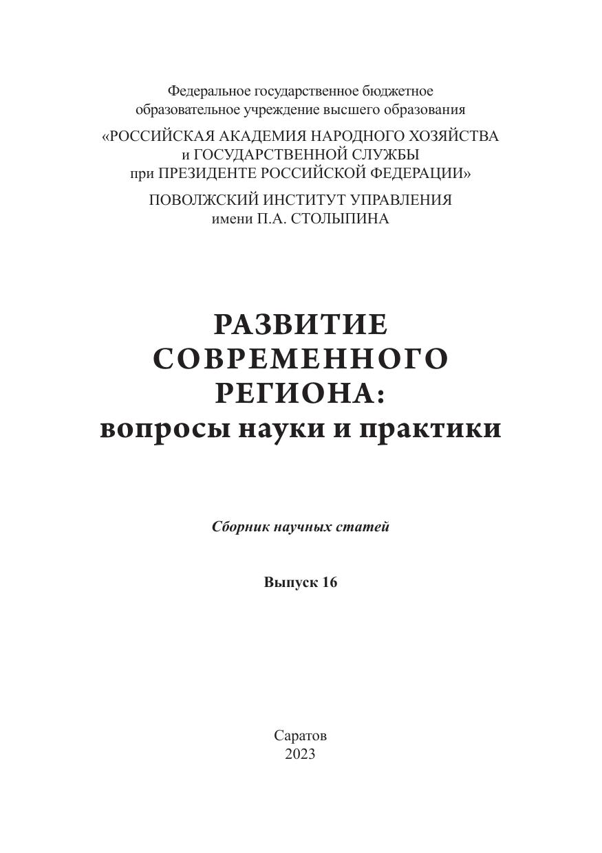 Сборник содержит статьи по материалам XVI Международной студенческой научно-практической конференции, проведенной 29–30 ноября 2022 года факультетом политико-правового управления Поволжского института управления имени П.А. Столыпина. В публикациях анализируются политико-правовые и социальные аспекты развития современного региона, закономерности и принципы управления им. Предлагаются инновационные модели в системе регионального управления. Для студентов, аспирантов, преподавателей, а также всех интересующихся вопросами регионального развития.
