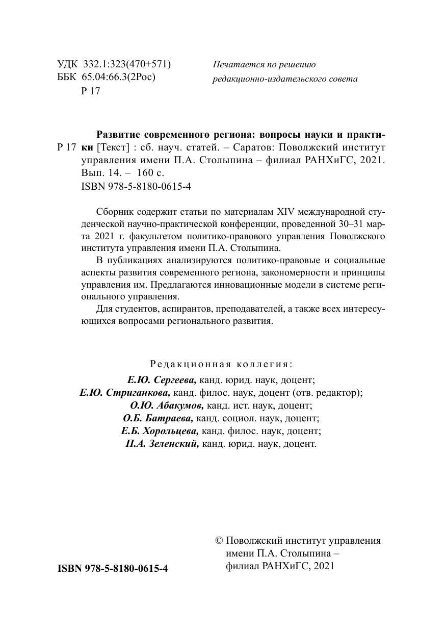 Сборник содержит статьи по материалам XIV международной студенческой научно-практической конференции, проведенной 30–31 марта 2021 г. факультетом политико-правового управления Поволжского института управления имени П.А. Столыпина. В публикациях анализируются политико-правовые и социальные аспекты развития современного региона, закономерности и принципы управления им. Предлагаются инновационные модели в системе регионального управления. Для студентов, аспирантов, преподавателей, а также всех интересующихся вопросами регионального развития.