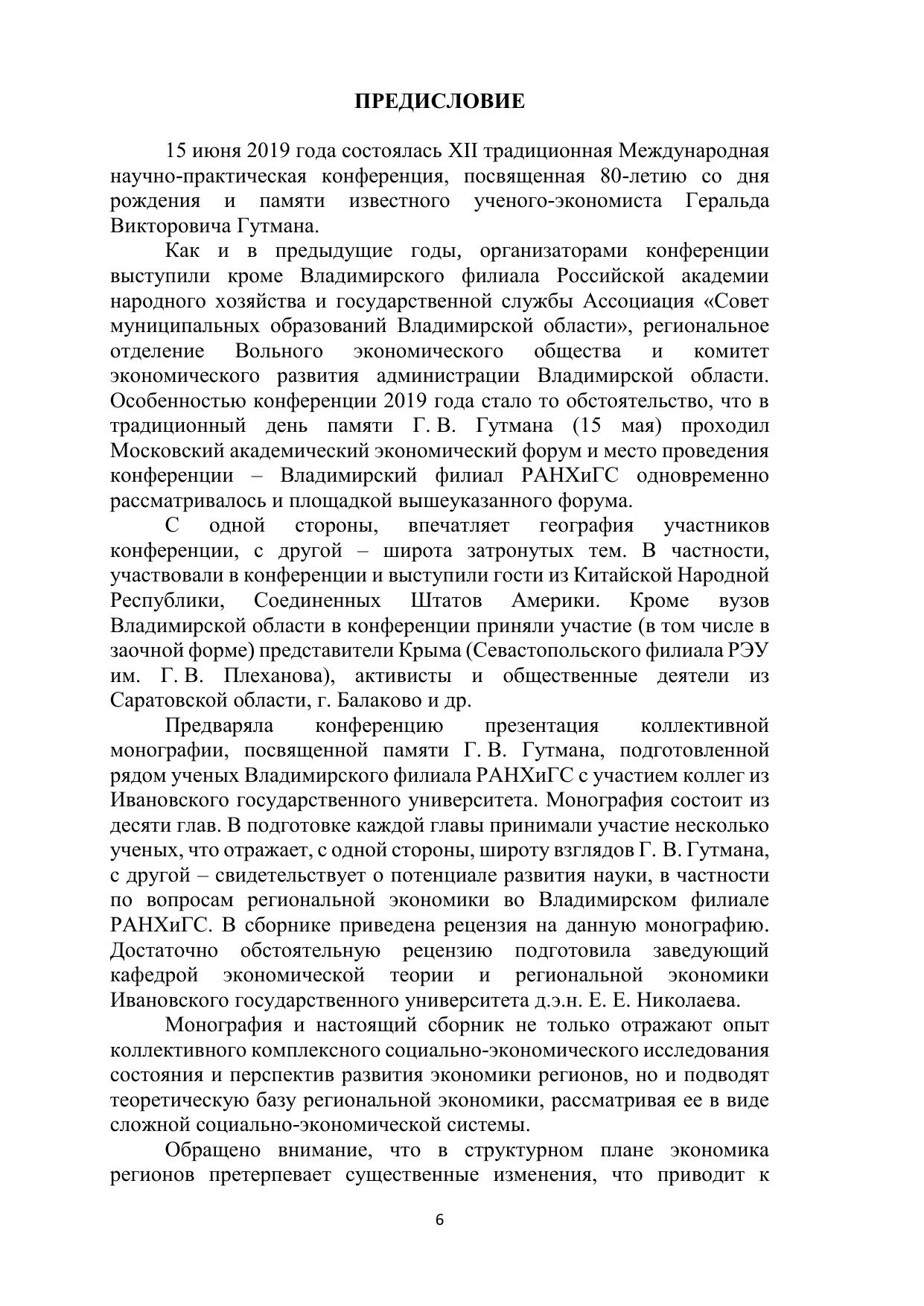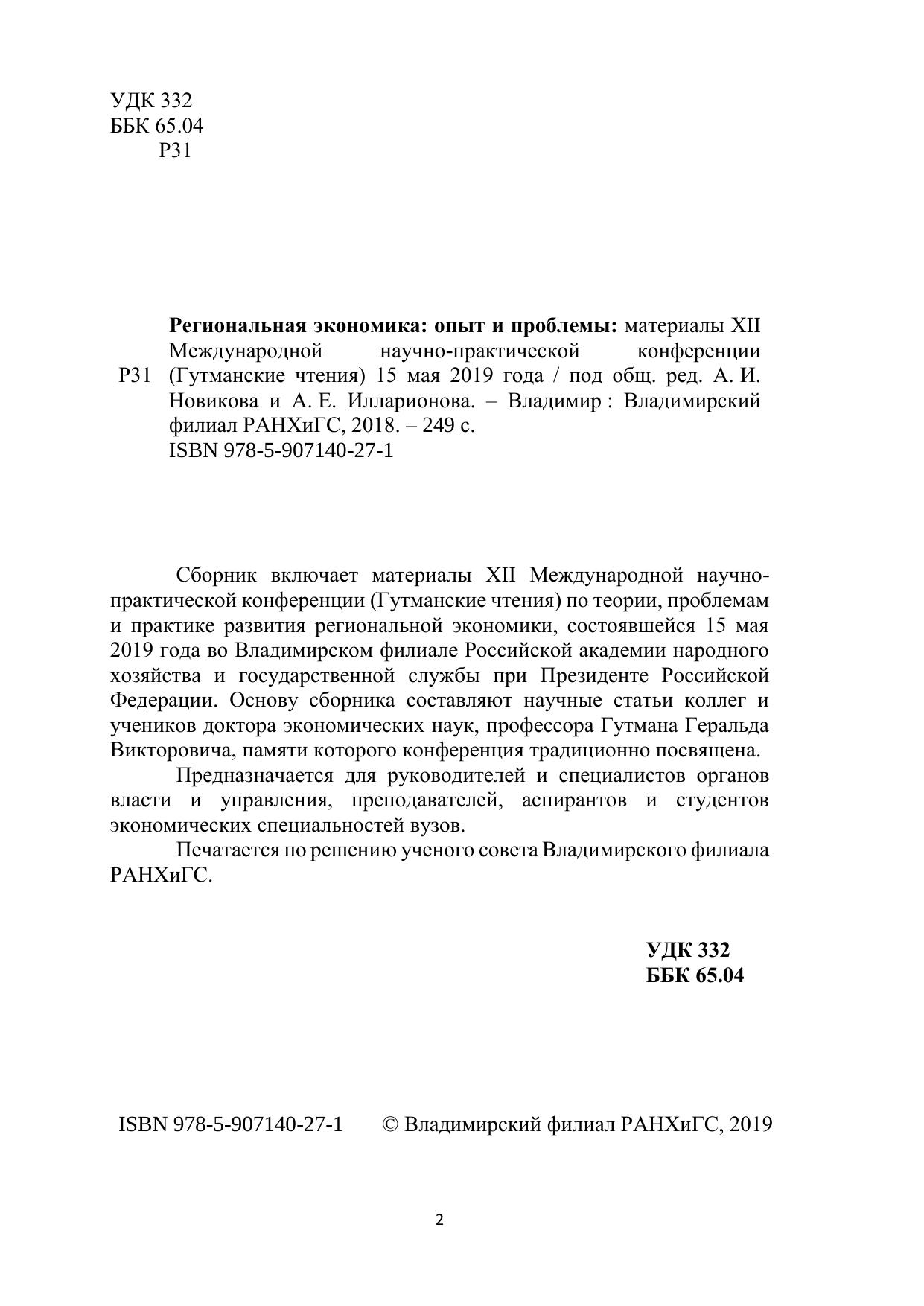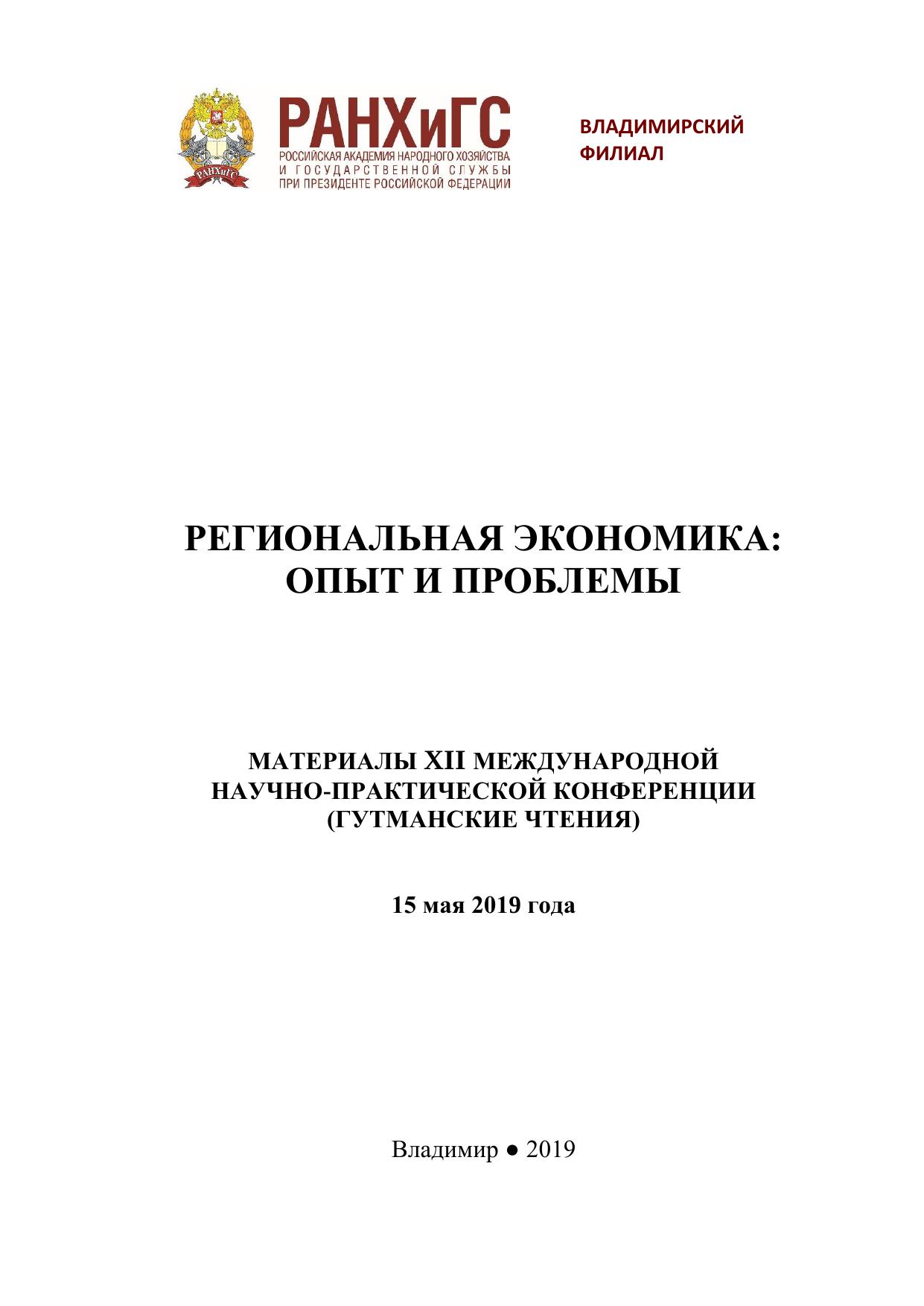 Сборник включает материалы XII Международной научно-практической конференции (Гутманские чтения) по теории, проблемам и практике развития региональной экономики, состоявшейся 15 мая 2019 года во Владимирском филиале Российской академии народного хозяйства и государственной службы при Президенте Российской Федерации. Основу сборника составляют научные статьи коллег и учеников доктора экономических наук, профессора Гутмана Геральда Викторовича, памяти которого конференция традиционно посвящена. Предназначается для руководителей и специалистов органов власти и управления, преподавателей, аспирантов и студентов экономических специальностей вузов. Печатается по решению ученого совета Владимирского филиала РАНХиГС.